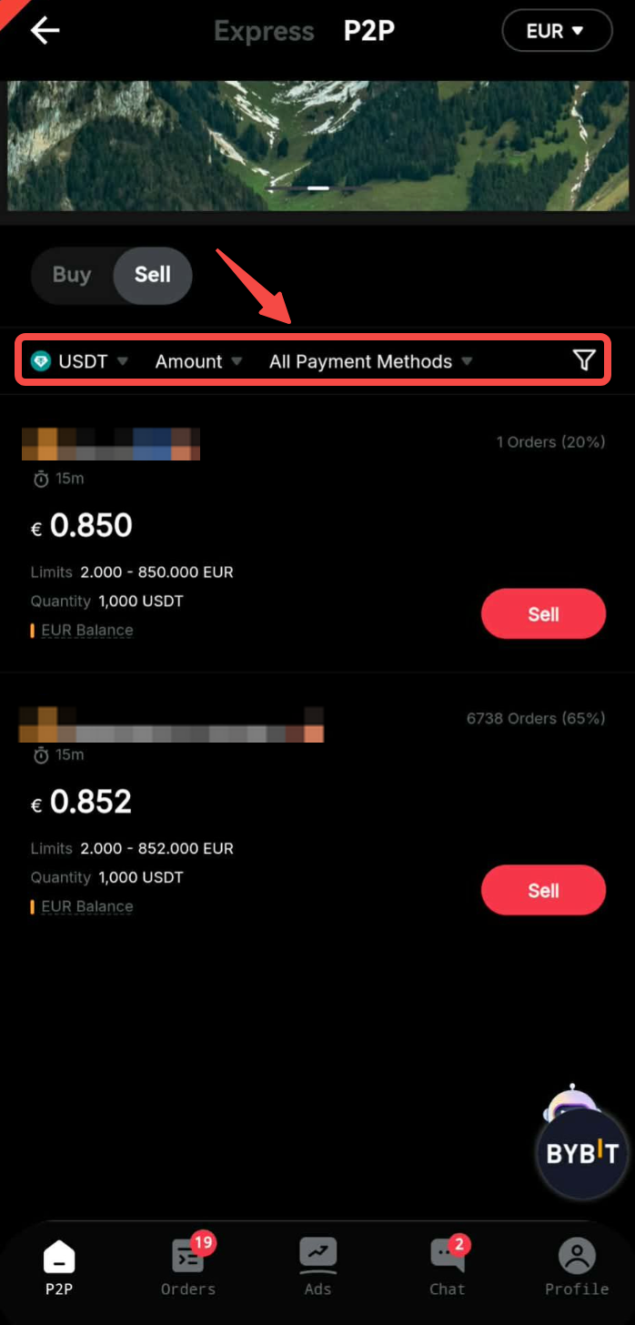 Langkah 2: Pada halaman Jual, Anda dapat menyaring pengiklan dengan memilih kriteria yang Anda inginkan untuk Mata Uang Fiat atau Metode Pembayaran — Saldo Fiat, berdasarkan kebutuhan transaksi Anda.