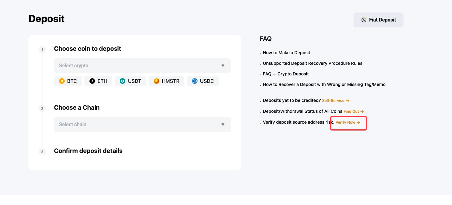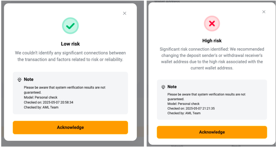 — Jika penilaian risiko memberikan hasil berisiko tinggi, disarankan untuk menggunakan alamat dompet lain untuk melakukan deposit.