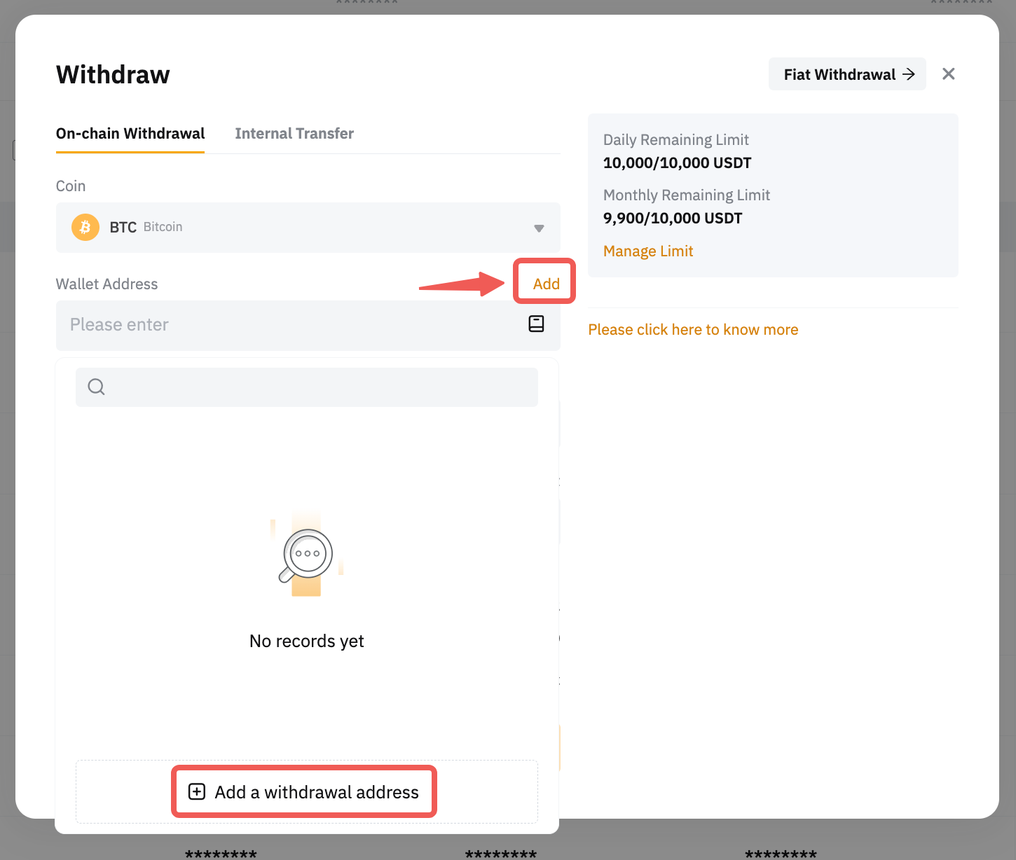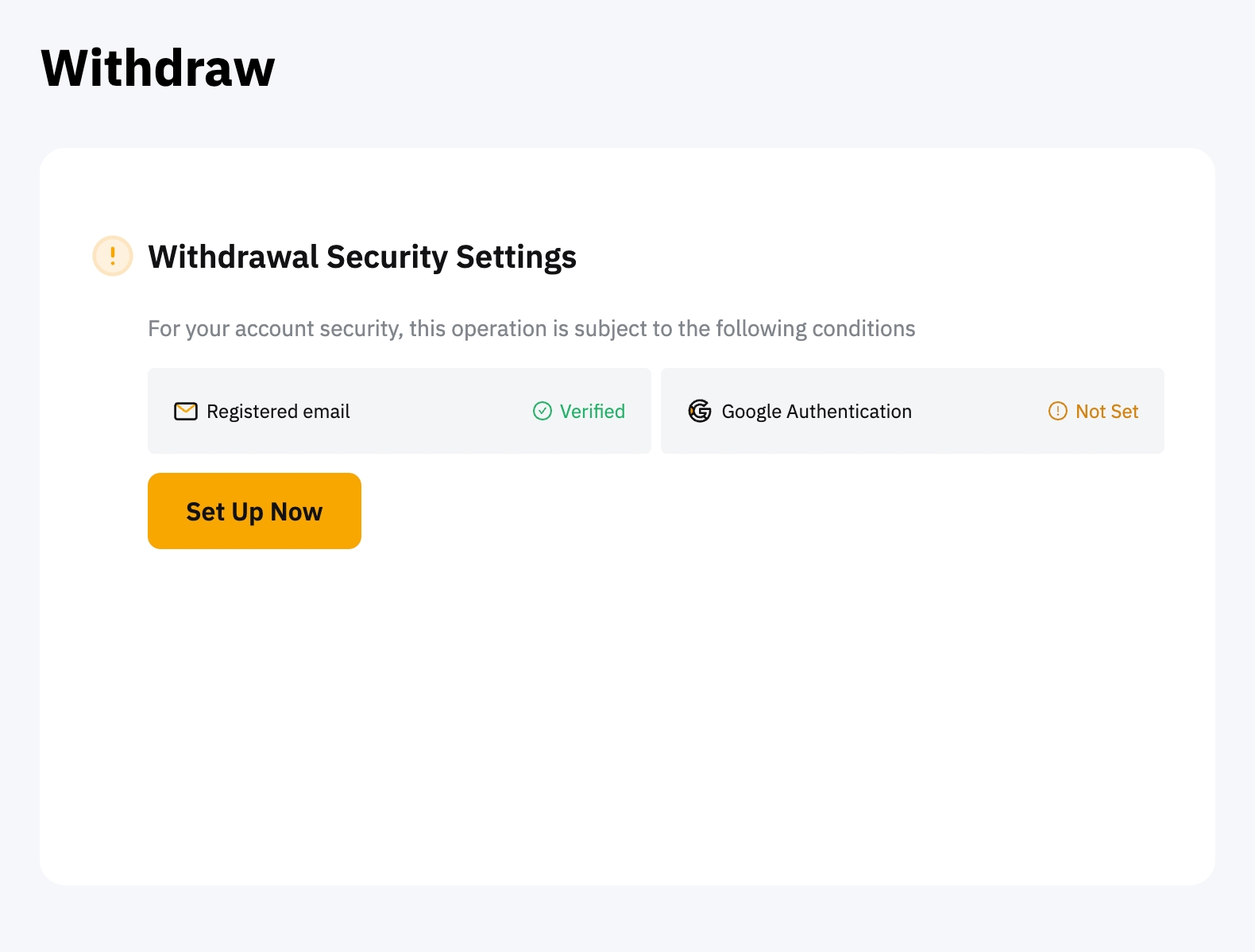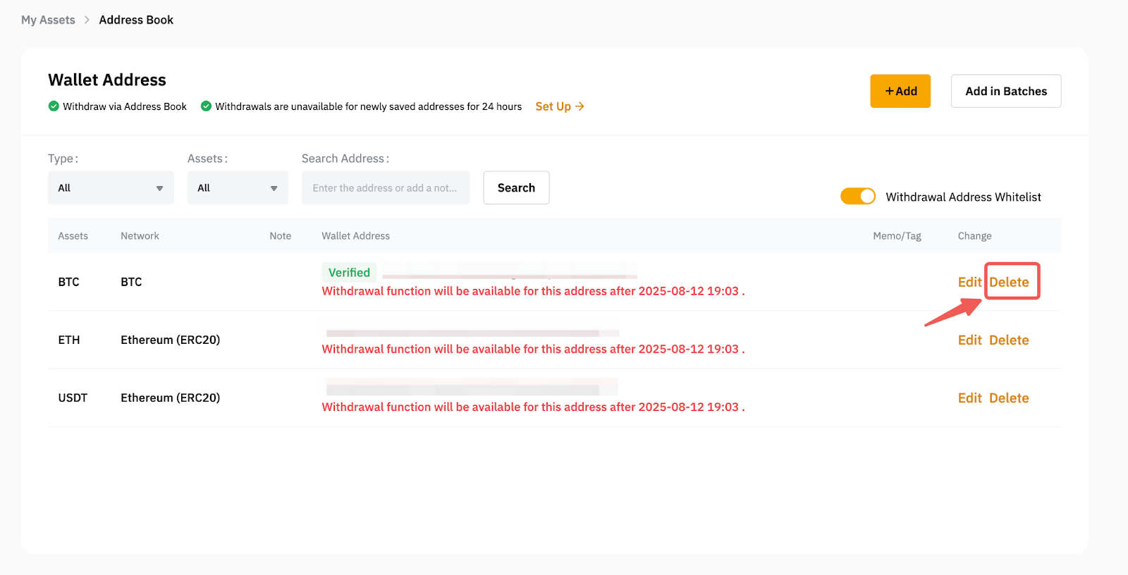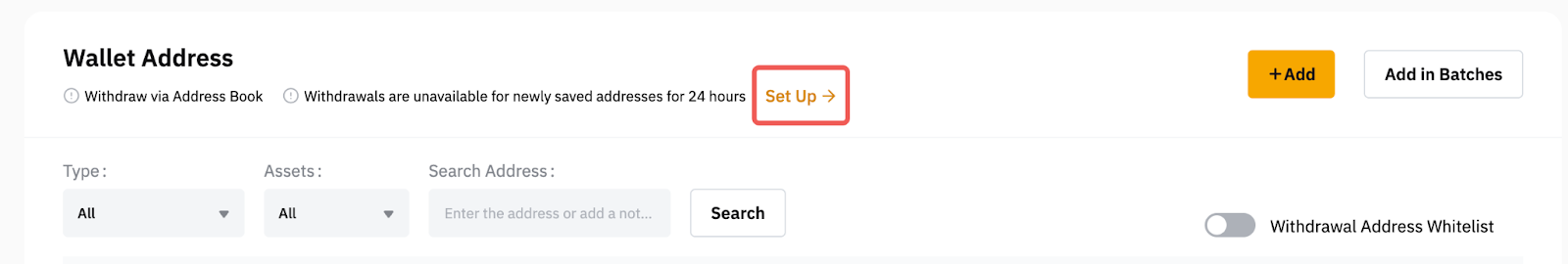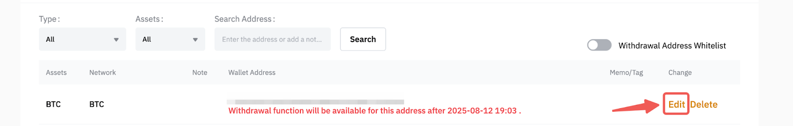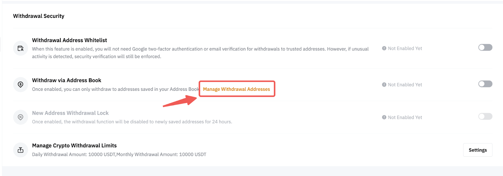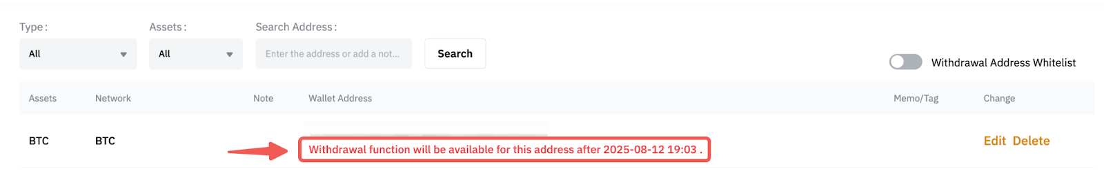 Jika Anda telah mengaktifkan fitur keamanan Kunci Penarikan Alamat Baru, misalnya, fungsi penarikan akan dibatasi selama 24 jam untuk alamat yang baru disimpan atau saat Anda menonaktifkan fitur keamanan.