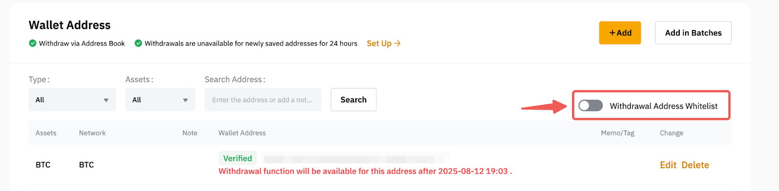Setelah alamat penarikan diverifikasi, Anda dapat memasukkan alamat ke daftar putih dengan mengaktifkan opsi Daftar Putih Alamat Penarikan. Dengan mengaktifkan pilihan tersebut, Anda dapat melakukan penarikan tanpa harus menyelesaikan email dan proses verifikasi keamanan 2FA.