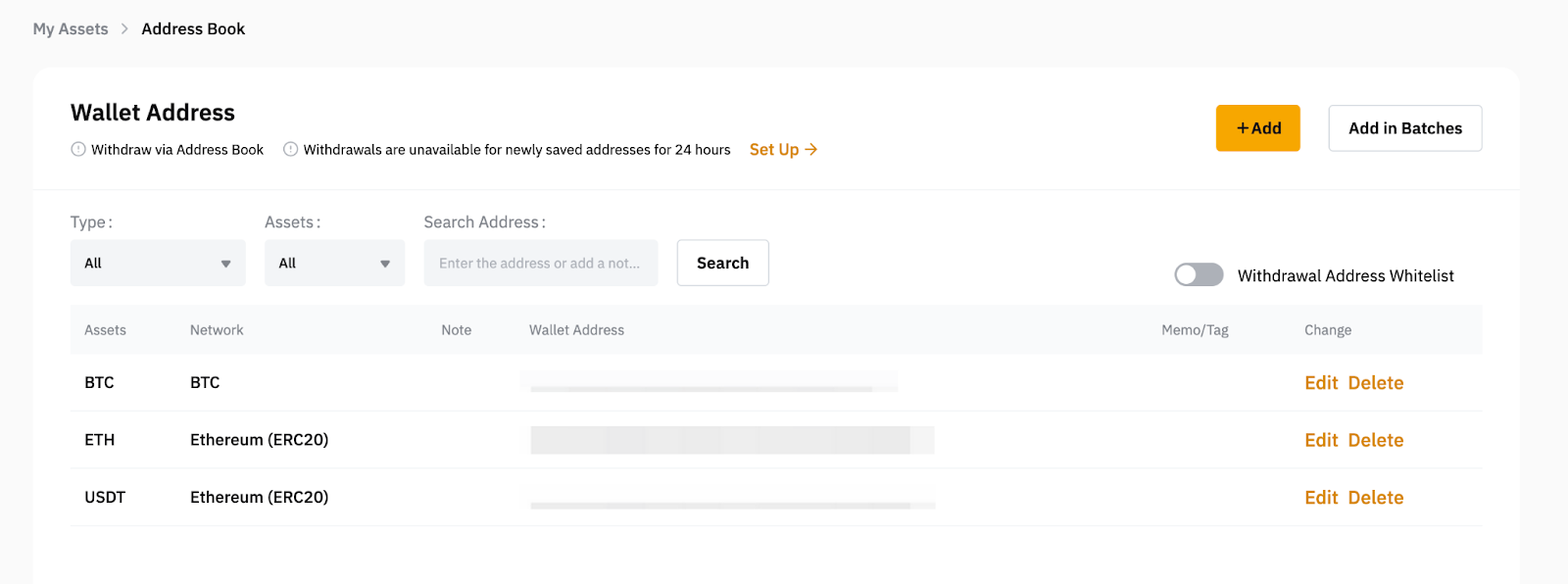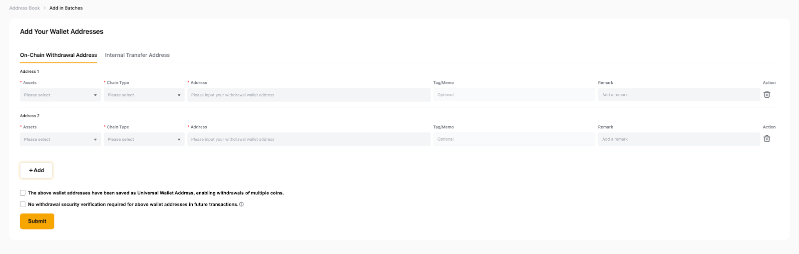 Jika Anda ingin menambahkan alamat dompet dalam satu kelompok untuk alamat penarikan on-chain dan alamat transfer internal, harap perhatikan hal-hal berikut: