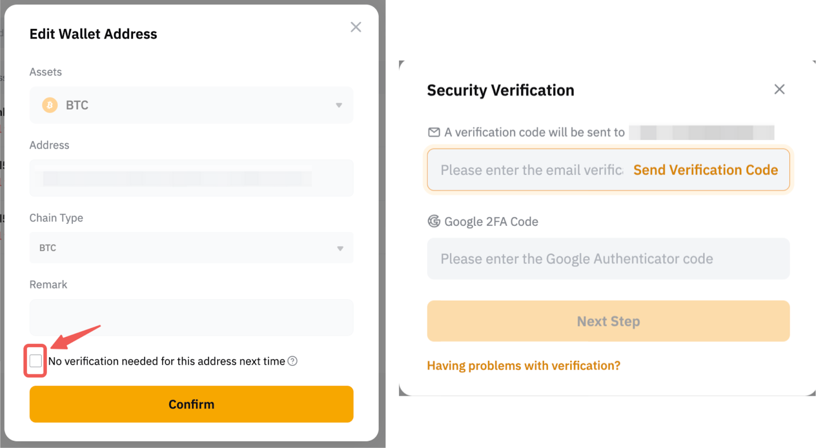 Anda dapat memverifikasi alamat penarikan bahkan setelah ditambahkan, dan sebaliknya. Untuk melakukannya, klik Edit, lalu klik centang atau hapus centang pada opsi Verifikasi tidak diperlukan untuk alamat ini di lain waktu di bawah jendela pop-up.