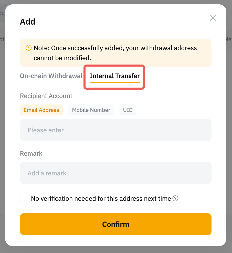 Jika ingin menambahkan akun Transfer Internal, cukup masukkan alamat email, nomor ponsel, atau UID akun Bybit yang ingin Anda tarik.