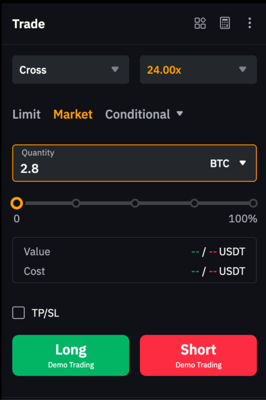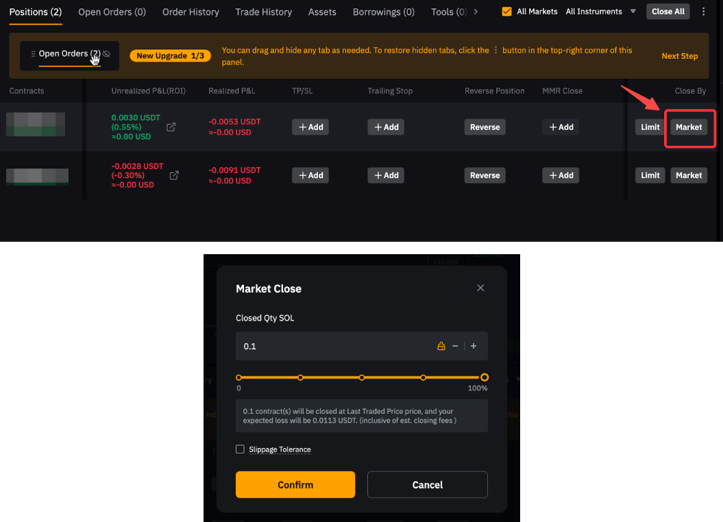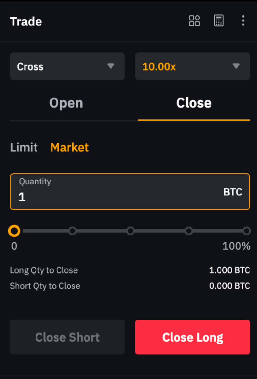 Misalnya, untuk menutup posisi long 1 BTC, buat pesanan pasar short 1 BTC. Harap diperhatikan, jika kuantitas pesanan melebihi ukuran posisi Anda saat ini, posisi baru yang arahnya berlawanan dapat terbuka.