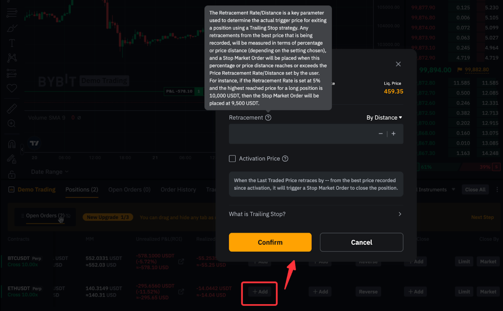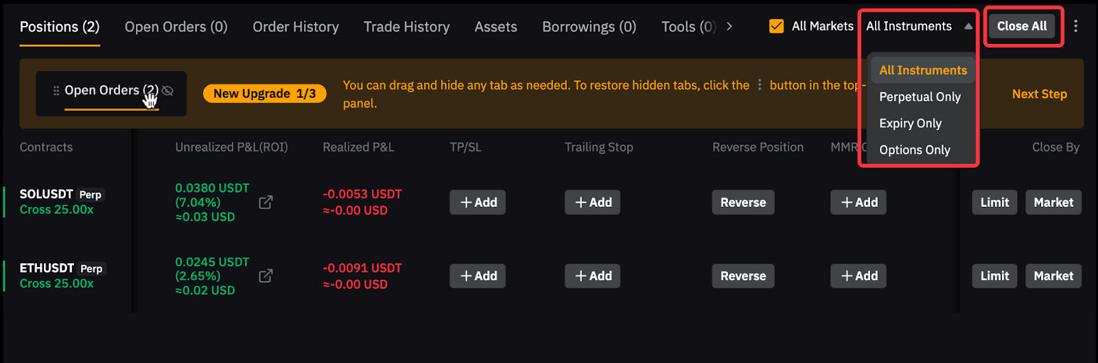 Catatan: Jika Anda tidak dapat menemukan pesanan manajemen risiko apa pun di atas di tampilan Aplikasi, Anda mungkin telah menonaktifkannya secara tidak sengaja di antarmuka posisi Anda. Untuk mengaktifkannya kembali, buka Kustomasi Antarmuka Posisi.