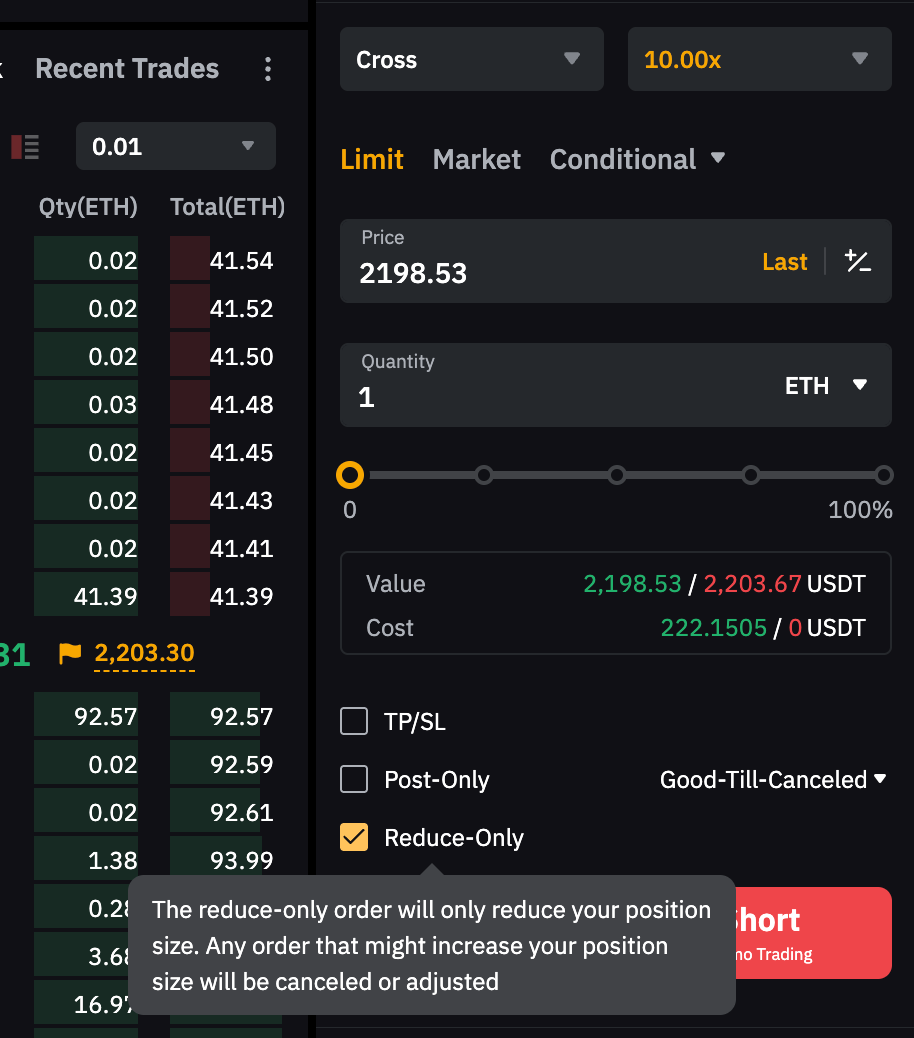 Anda juga dapat menggunakan alat pembuatan pesanan yang lebih kompleks untuk menutup posisi. Pastikan Anda memilih Hanya Kurangi untuk menghindari pembukaan posisi baru yang tidak disengaja. Untuk mendapatkan informasi selengkapnya, silakan baca panduannya masing-masing: