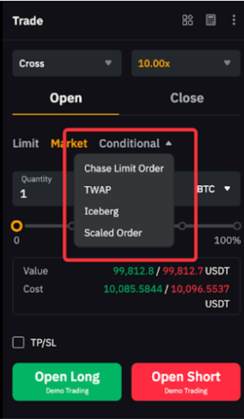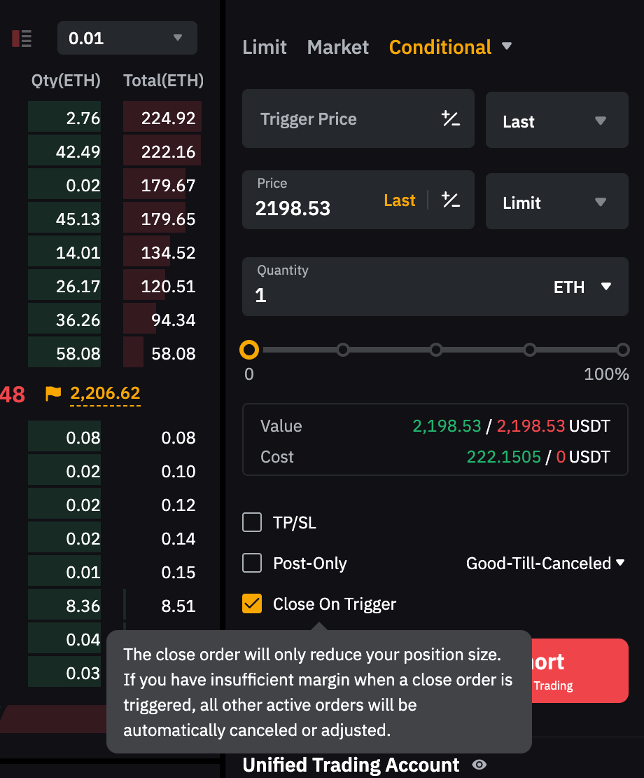 Untuk mempelajari selengkapnya tentang perbedaan antara pesanan terbatas dan pesanan bersyarat, bacalah Jenis Pesanan yang Tersedia di Bybit.