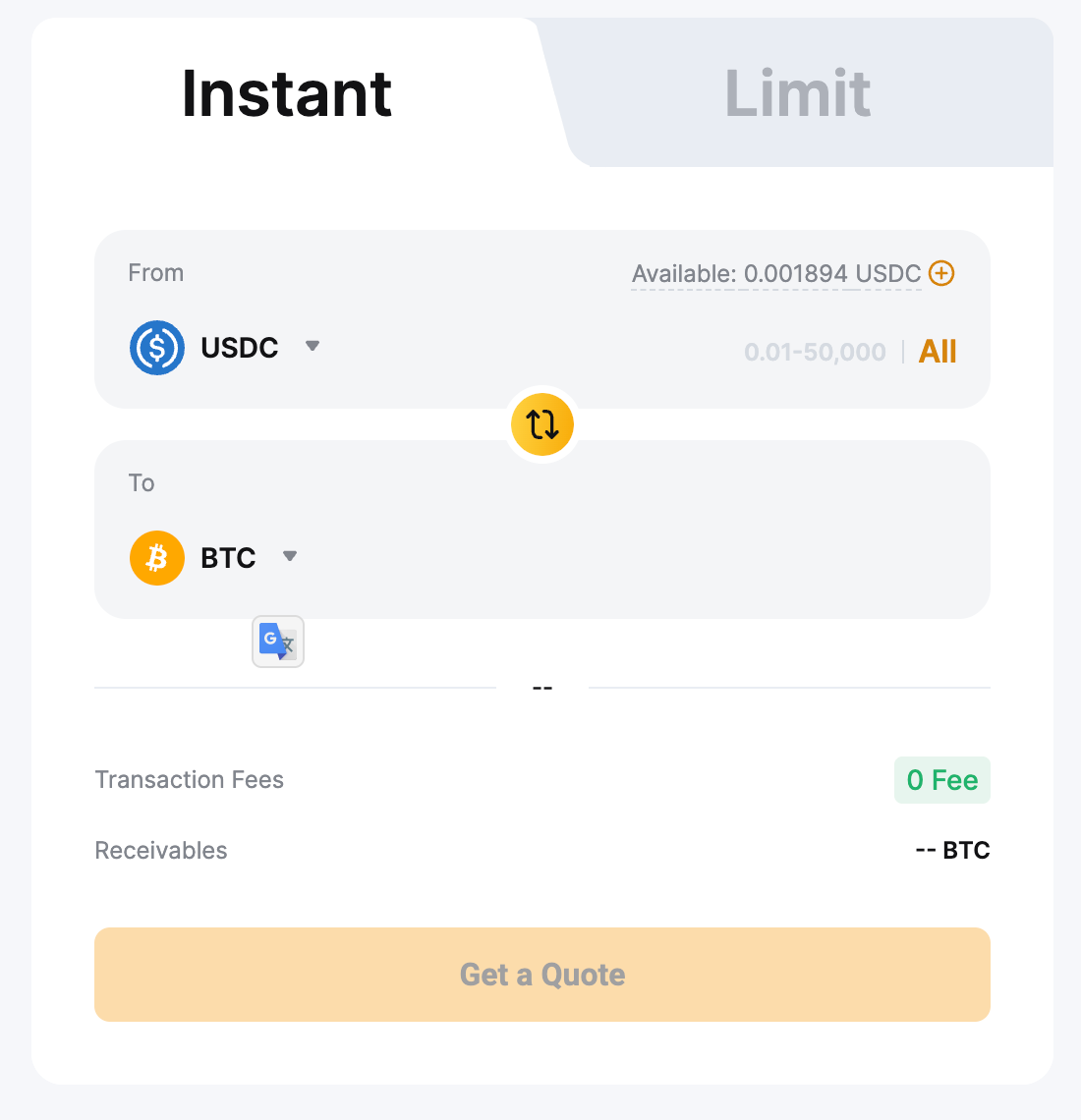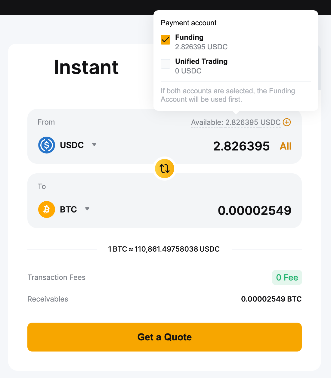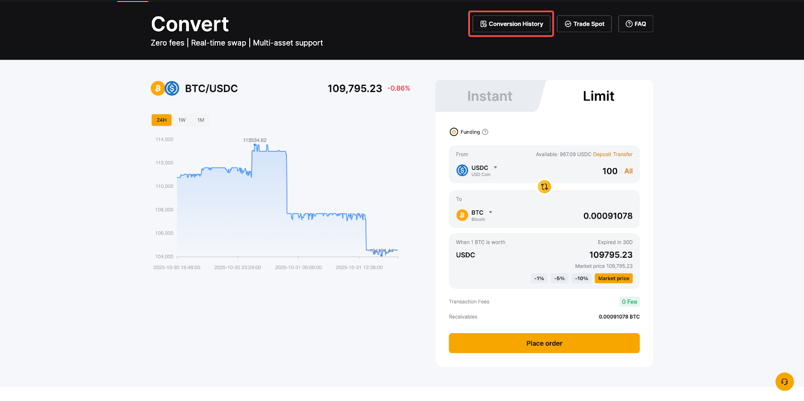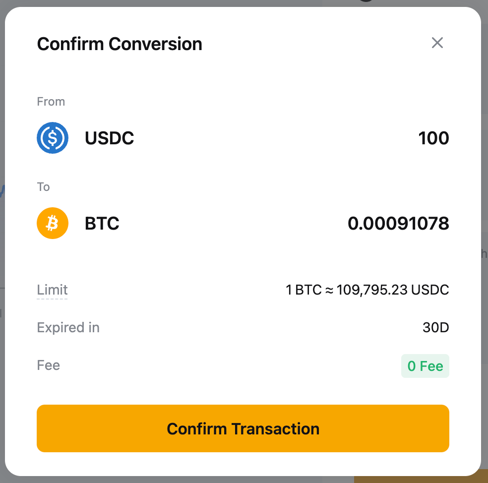 1. Mode instan didukung pada Akun Pendanaan dan Akun Perdagangan Terpadu, sedangkan mode Batas hanya tersedia melalui Akun Pendanaan. Pastikan dana Anda berada di akun yang benar sebelum melanjutkan konversi.