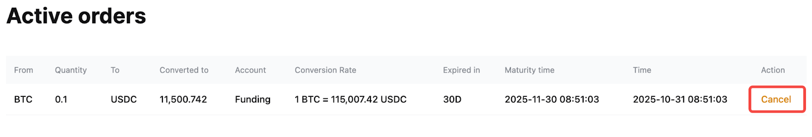 — Pesanan terbatas yang dibuat melalui Konversi berlaku selama 30 hari. Aset yang terlibat akan dikunci hingga pesanan terpenuhi atau kedaluwarsa. Jika tidak dipenuhi dalam waktu 30 hari, pesanan akan dibatalkan secara otomatis.