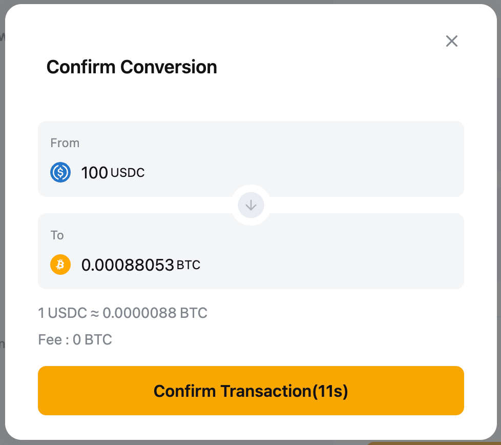 Tinjau perincian dan klik Konfirmasi Transaksi jika Anda puas dengan tarif tersebut. Transaksi akan segera dieksekusi, dan aset yang dikonversi akan dikreditkan ke akun yang dipilih.