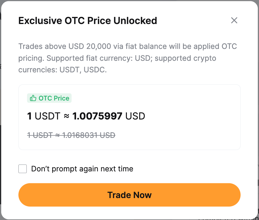 — Harap diperhatikan bahwa Harga OTC hanya berlaku untuk konversi kripto antara USDT, USDC, ETH, BTC, dan MNT. Untuk informasi selengkapnya tentang Perdagangan OTC, silakan merujuk ke T&J — Perdagangan OTC.