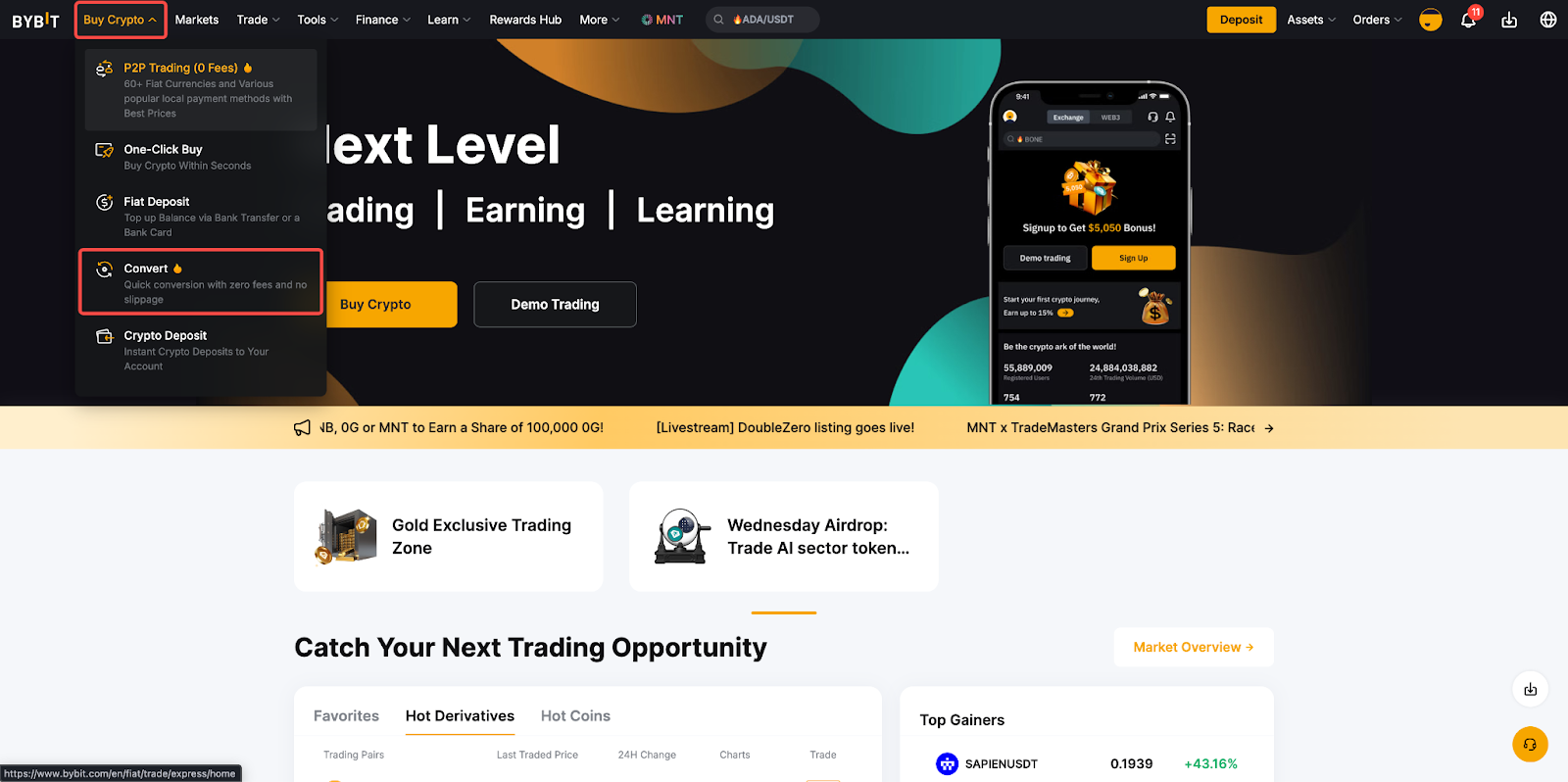 Langkah 1: Beli Kripto pada bilah navigasi bagian atas dan klik Convert.