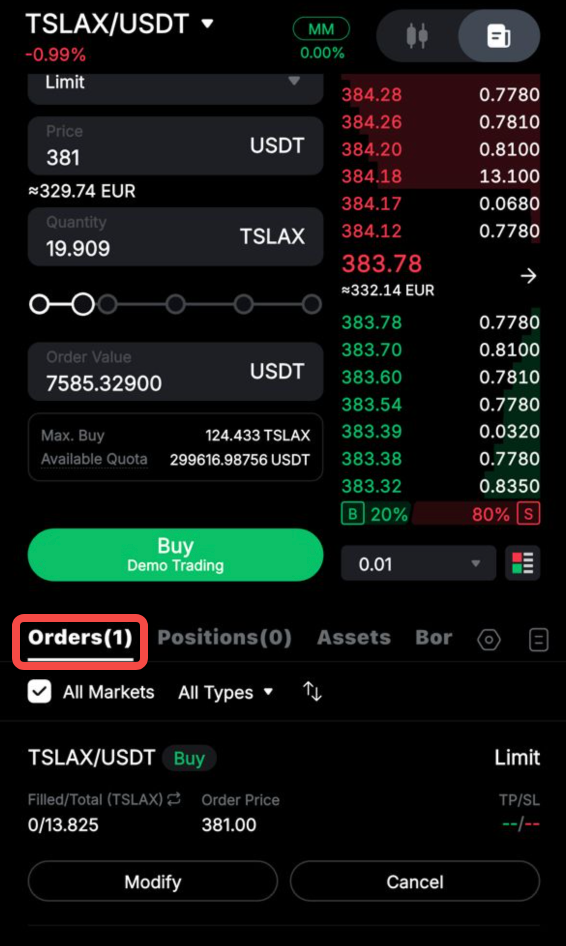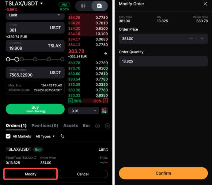 Ketuk Modifikasi di bawah parameter pesanan Anda untuk mengedit detail seperti harga pesanan, harga pemicu, atau kuantitas pesanan Anda. Anda juga dapat beralih antara harga saham dan harga token di halaman modifikasi pesanan dan halaman riwayat pesanan.