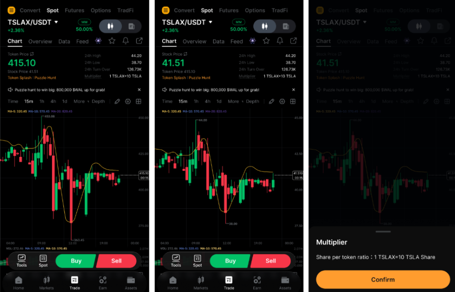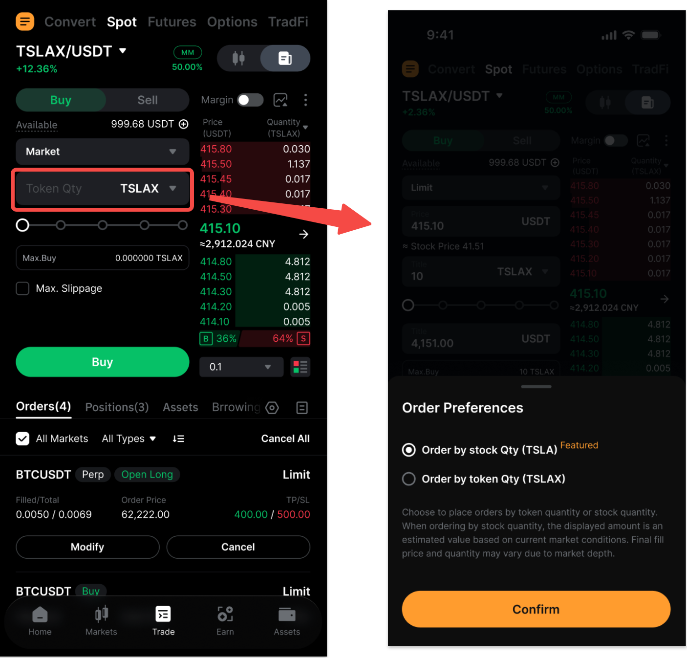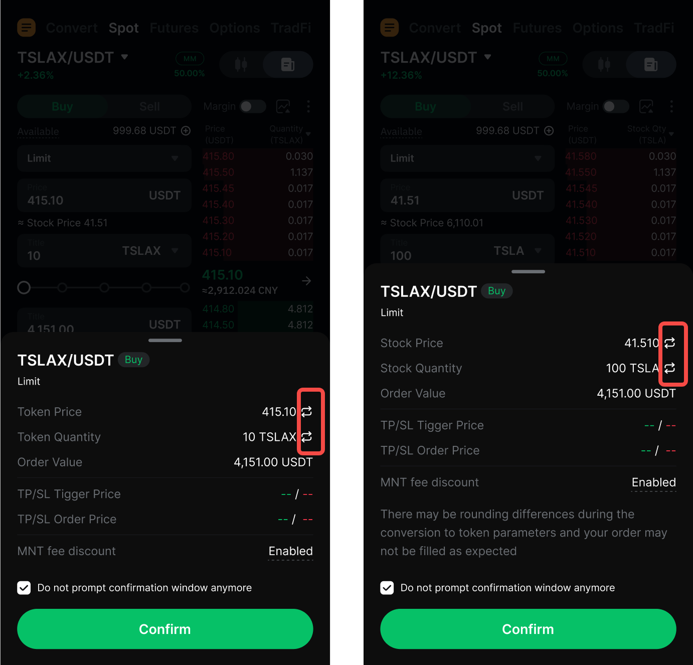 Pengguna juga dapat beralih antara harga token dan harga saham dasar menggunakan tombol panah ganda di halaman Trading, halaman Penempatan Pesanan, atau halaman Riwayat Pesanan.