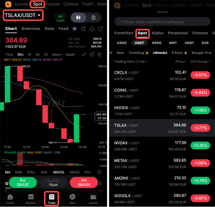 Langkah 1: Pastikan Anda berada di tab Spot dan pilih pasangan trading xStocks yang ingin Anda perdagangkan.