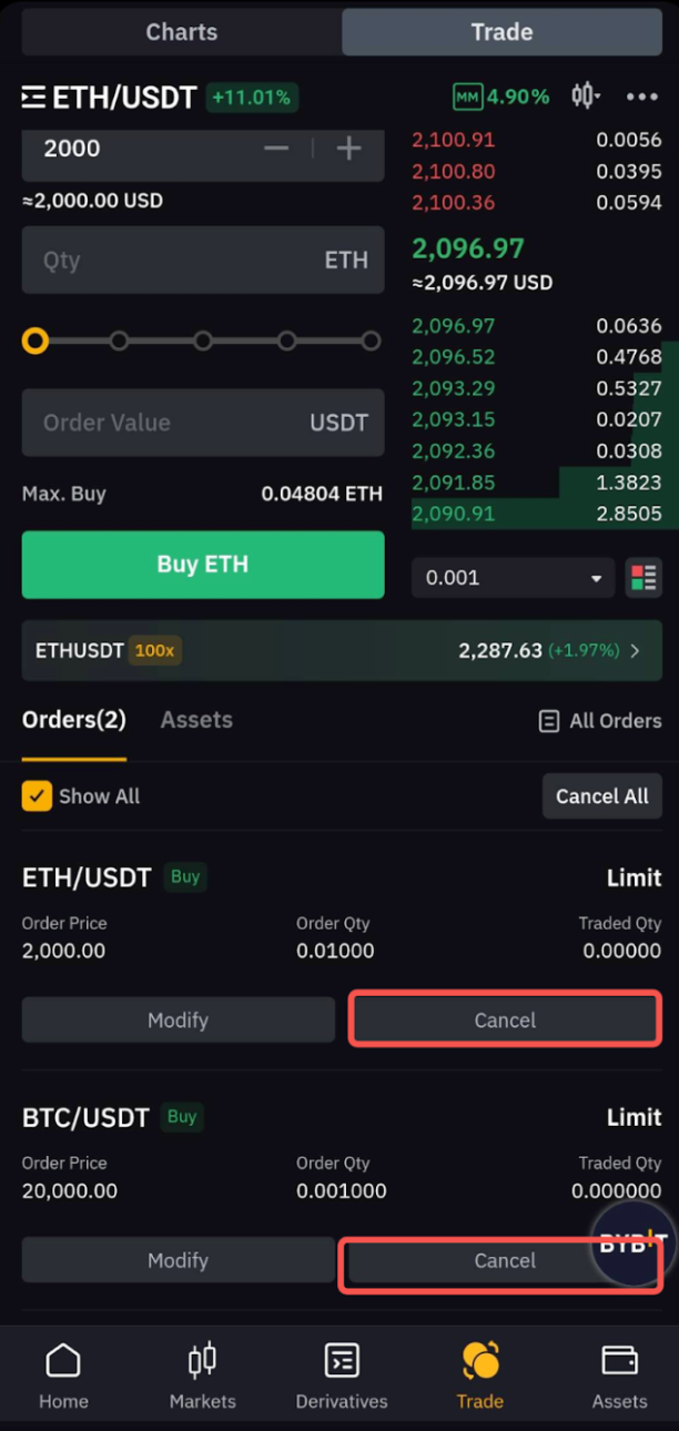 Penting untuk dicatat bahwa jika Anda telah memilih opsi Tampilkan Semua , mengetuk Batalkan Semua akan membatalkan pesanan dari semua pasangan trading.