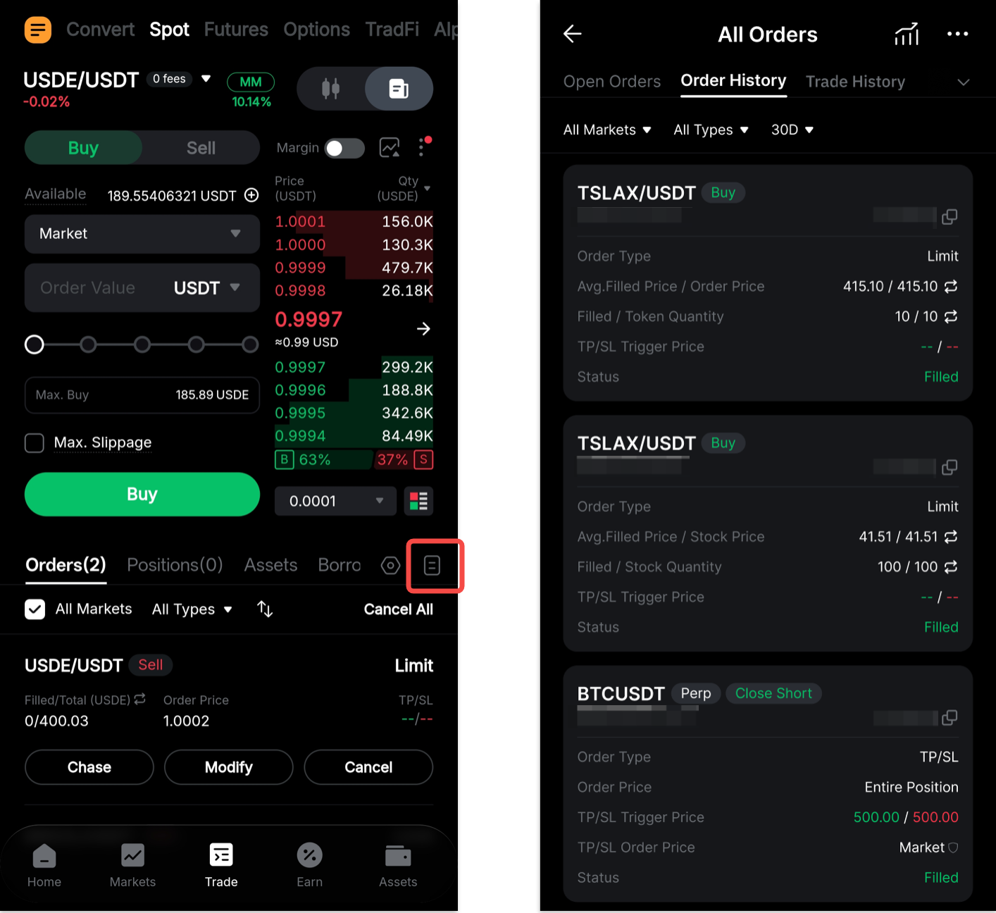 Ketuk ikon Riwayat Pesanan di sudut kanan atas bagian tab Posisi untuk melihat riwayat pesanan dan riwayat trading Anda.