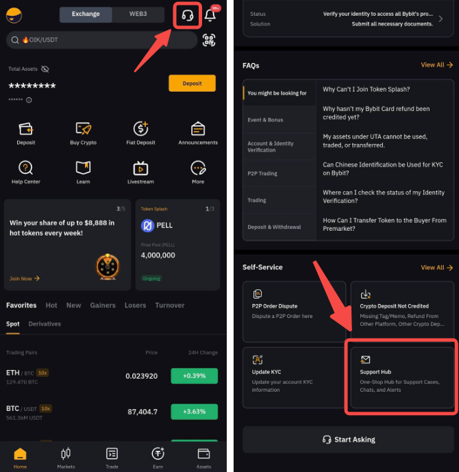Untuk memeriksa status sengketa transaksi kartu Anda, ketuk ikon Dukungan di sudut kanan atas beranda Aplikasi Bybit. Gulir ke bawah untuk menemukan Support Hub, tempat Anda dapat menindaklanjuti kasus Anda jika ada tindakan yang diperlukan.