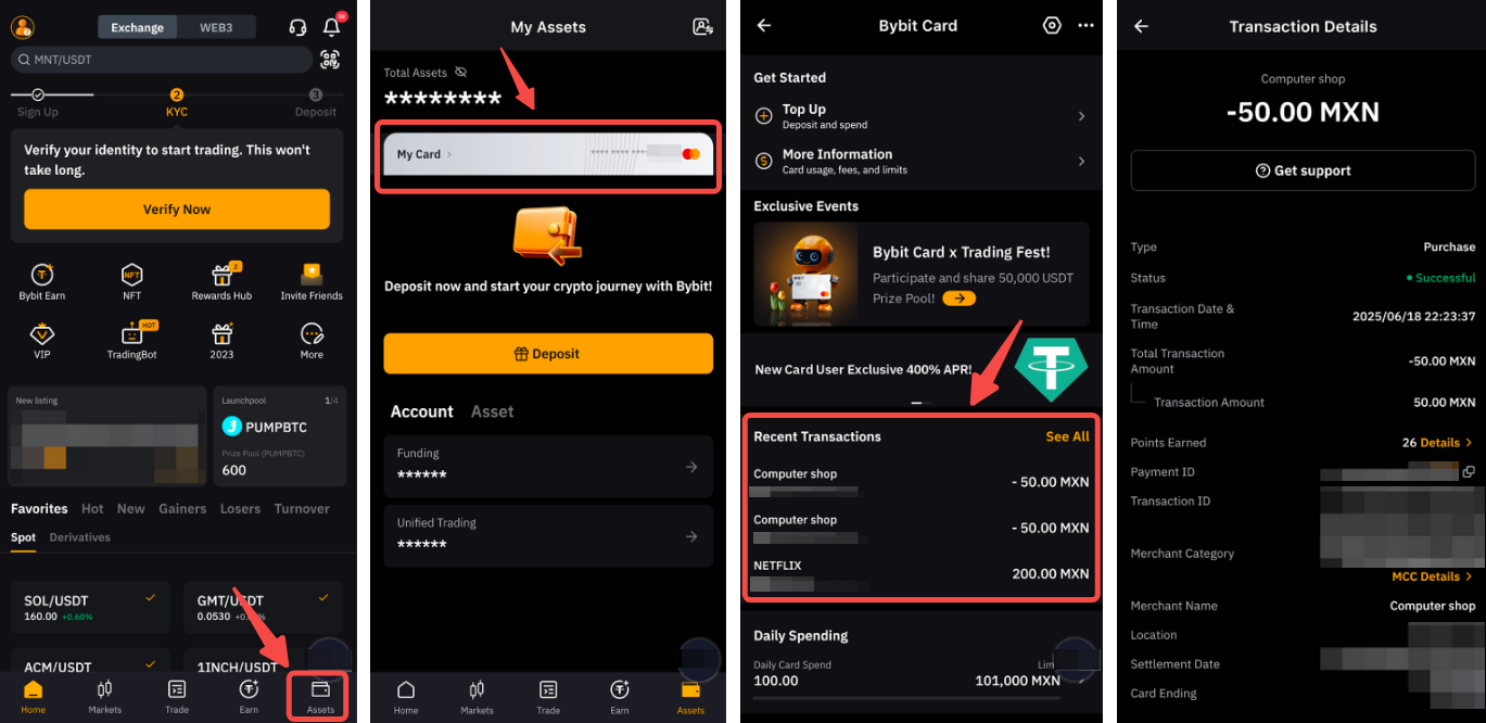Langkah 1: Masuk ke Aplikasi Bybit Anda, lalu buka Aset → Kartu Saya. Gulir ke bawah ke Transaksi Terbaru → Transaction Details, lalu ketuk Dapatkan dukungan.