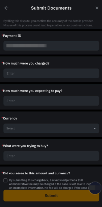 — Anda hanya dapat mengajukan satu sengketa per transaksi. Permintaan chargeback duplikat tidak akan diterima.