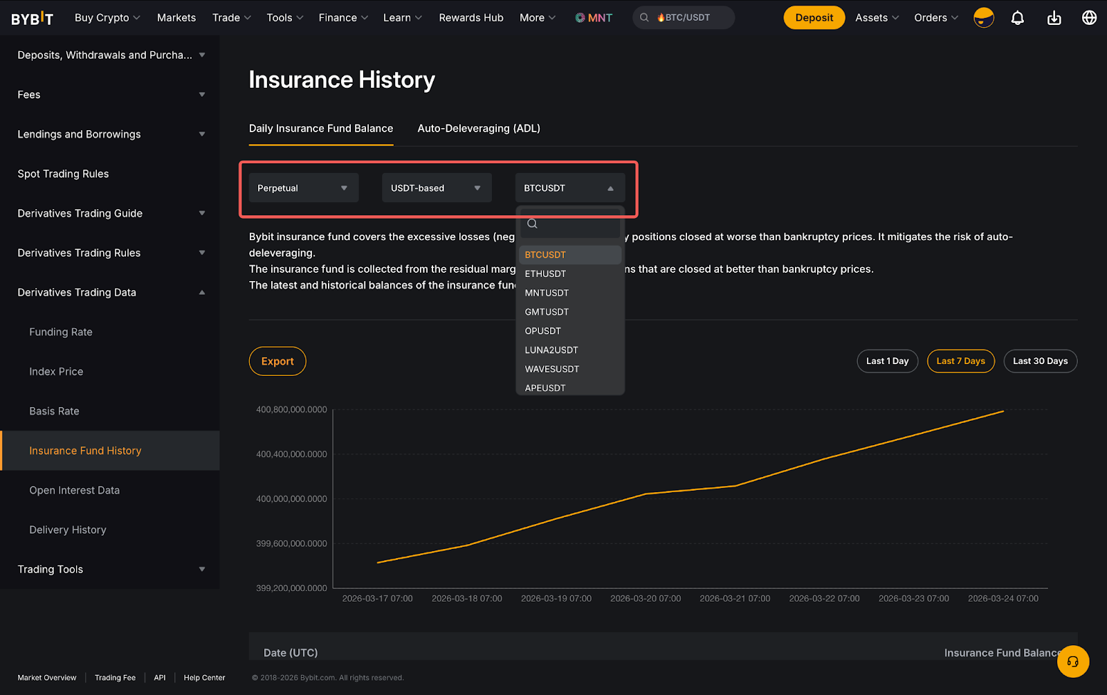 Untuk melihat saldo dana asuransi Bybit untuk semua kontrak Perpetual dan Berjangka, navigasi ke Ikhtisar Pasar Bybit dan pilih Riwayat Dana Asuransi.