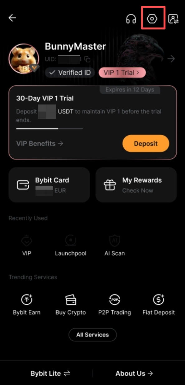 Langkah 1: Buka Aplikasi Bybit, ketuk gambar profil Anda di sudut kiri atas, lalu ketuk ikon Pengaturan untuk membuka Pusat Pengguna.