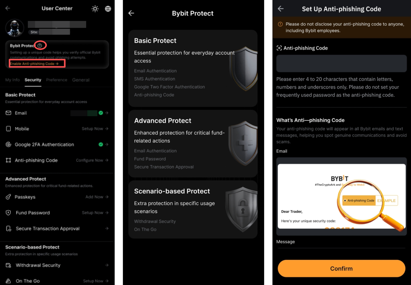 - Selalu periksa kode antipenipuan di dalam email atau pesan SMS dari Bybit untuk memastikan bahwa pesan tersebut asli.