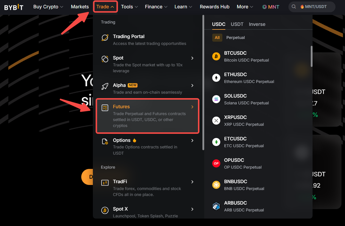 Langkah 1: Masuk ke akun Bybit Anda dan klik Perdagangan → Futures di bilah navigasi atas.