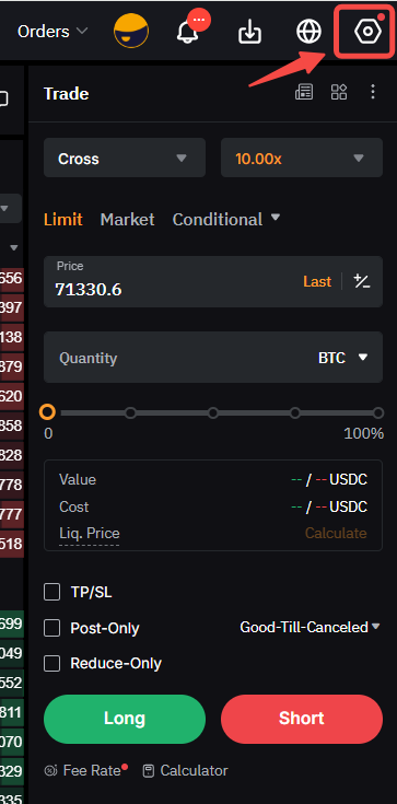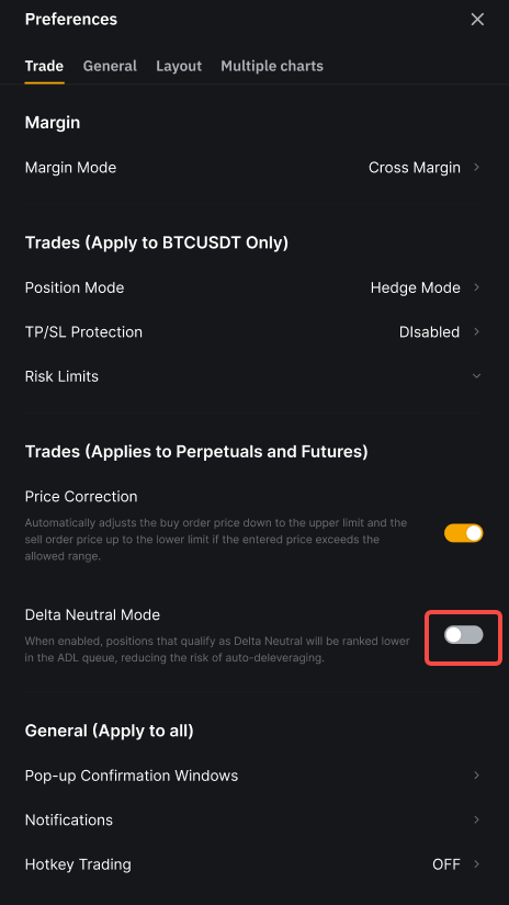 Langkah 3: Di bawah tab Perdagangan, aktifkan tombol Mode Delta Netral.