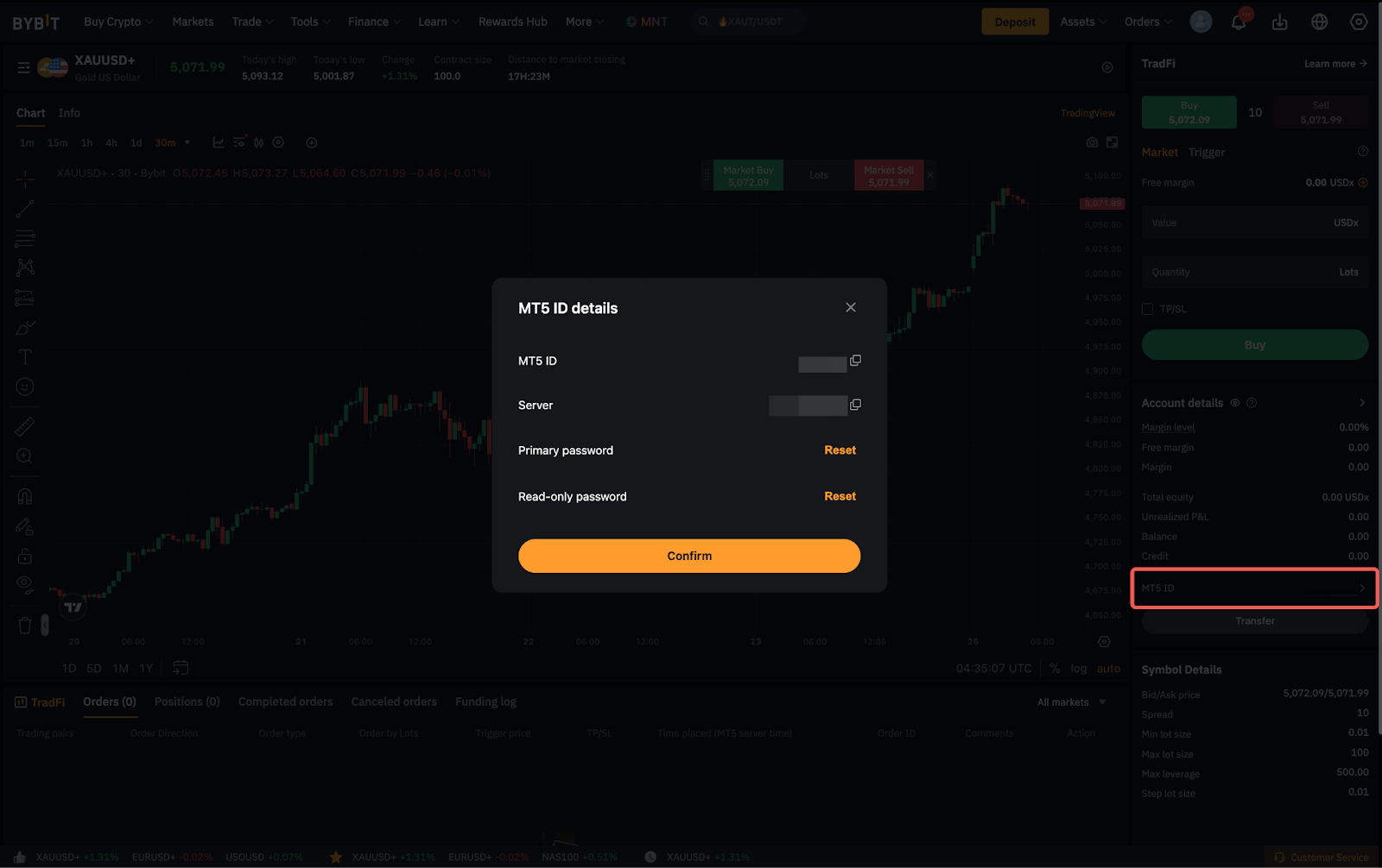 Namun, jika Anda ingin berdagang melalui platform MT5, Anda harus masuk menggunakan kredensial masuk TradFi (MT5) Anda, yang akan berbeda dari akun Bybit (UID) Anda. Anda dapat menemukan detail ID MT5 Anda di bawah bagian Detail Akun di halaman Bybit TradFi.