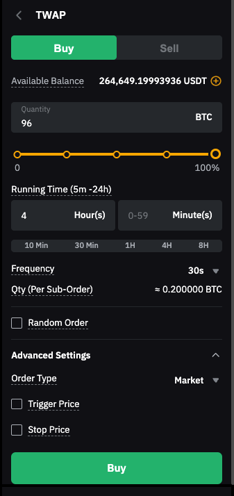 Dengan 14.400 detik, strategi TWAP akan membagi 96 BTC menjadi 480 pesanan (14.400/30 detik). Dalam total waktu berjalan 4 jam, pesanan pasar 0,2 BTC (96 BTC/480 pesanan) akan ditempatkan setiap 30 detik.