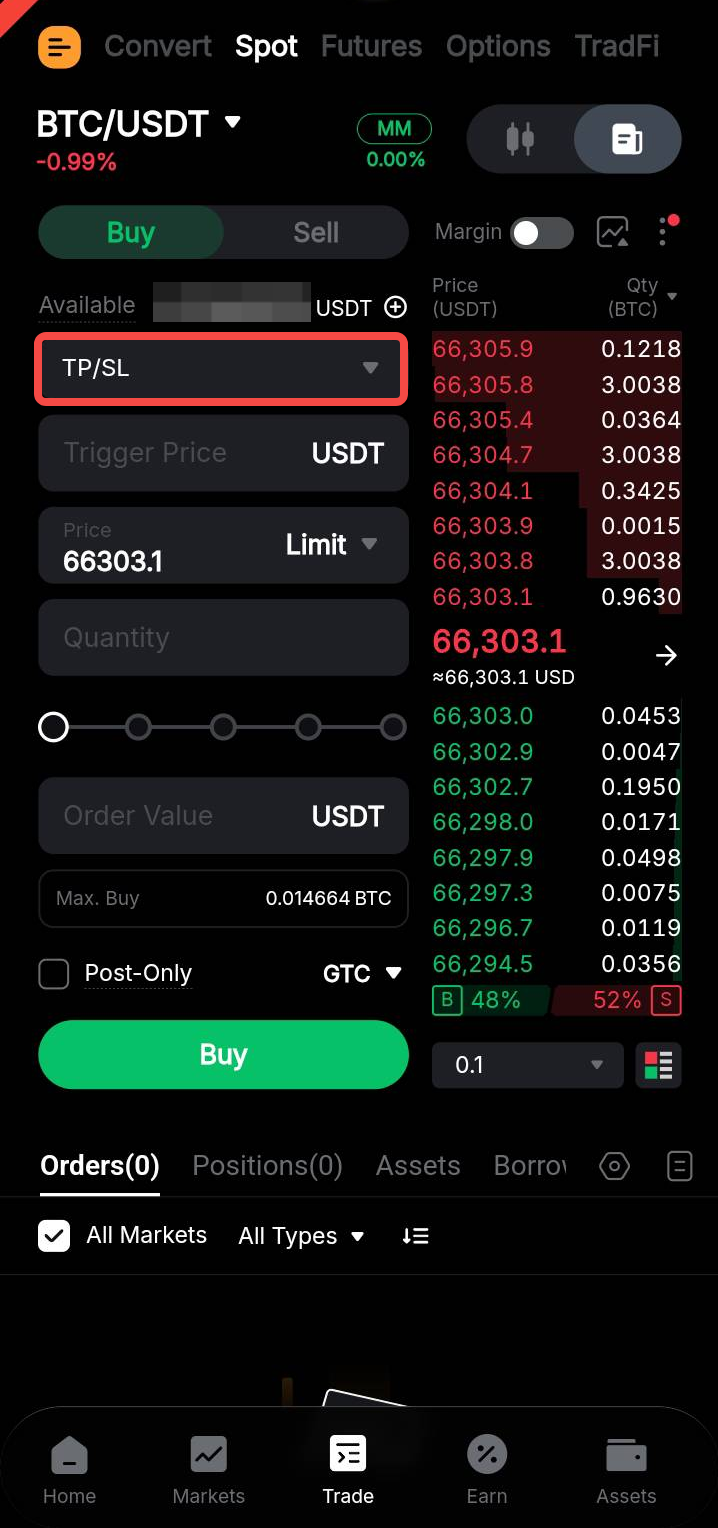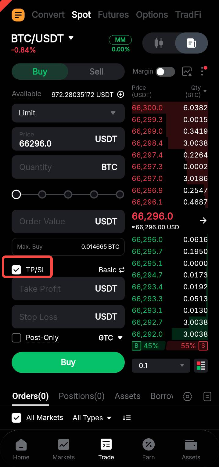 Selain menempatkan pesanan Limit, trader memiliki opsi untuk menyertakan serangkaian pesanan TP atau SL. Setelah pesanan Limit dieksekusi, pesanan TP dan SL secara otomatis ditempatkan berdasarkan harga yang telah ditetapkan sebelumnya dan kuantitas pesanan yang ditentukan.