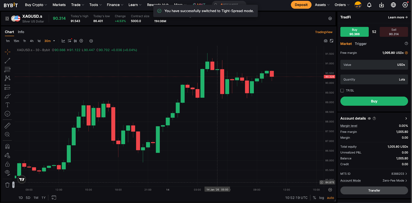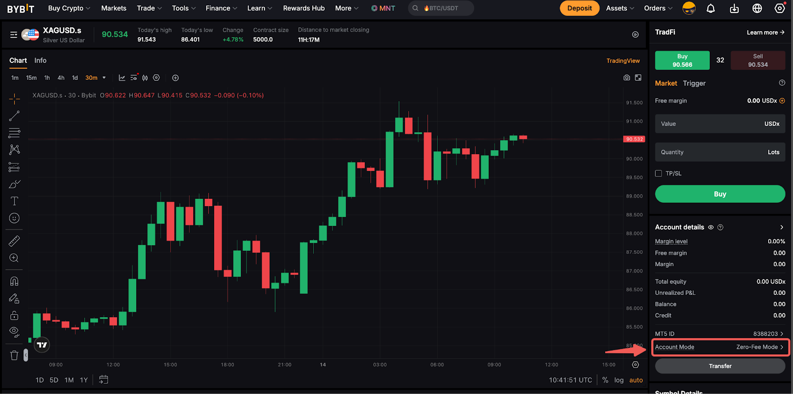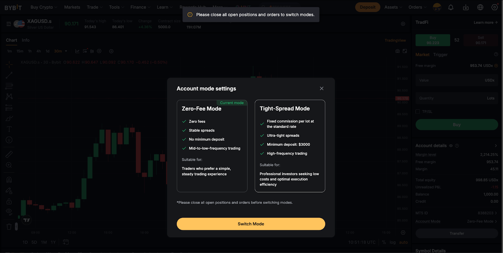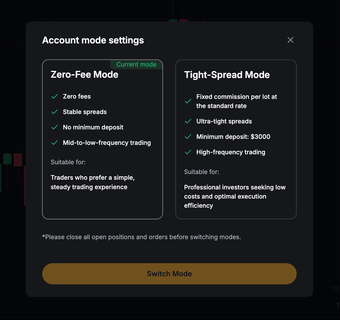 Secara default, antarmuka perdagangan TradFi pengguna diatur ke mode Zero-Fee, sedangkan mode Tight-Spread hanya dapat diaktifkan dengan memenuhi persyaratan tertentu. Pengguna dapat menentukan mode akun saat ini untuk akun TradFi mereka dengan memeriksa bagian Mode Akun di bawah Detail Akun.