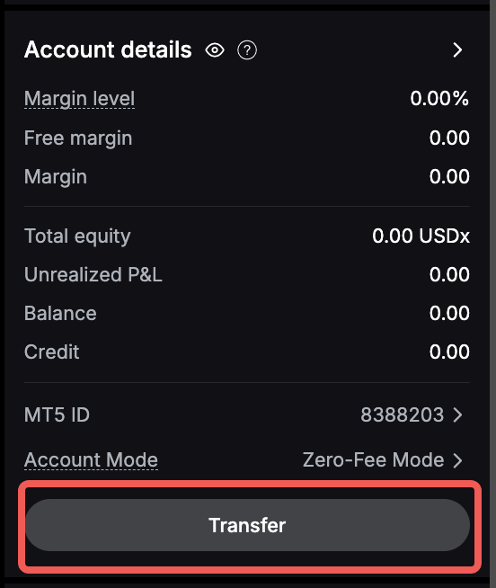 - Jika Anda gagal memenuhi persyaratan setoran, klik tombol Transfer pada Perincian Rekening dan lakukan transfer yang diperlukan ke rekening TradFi Anda.