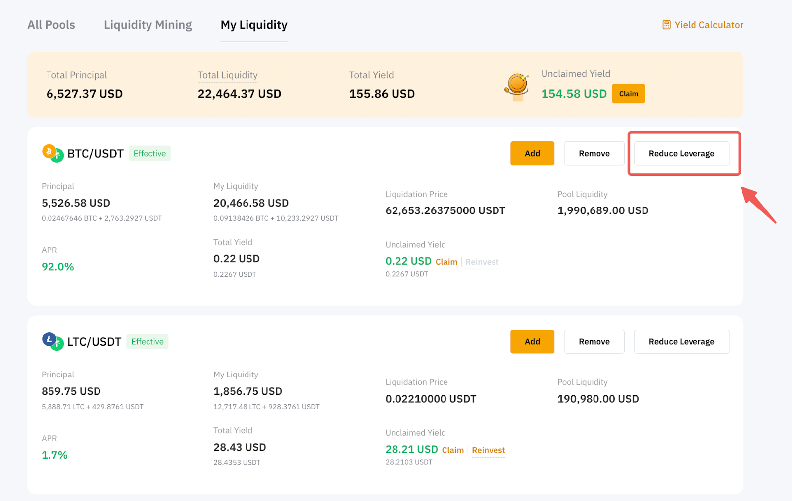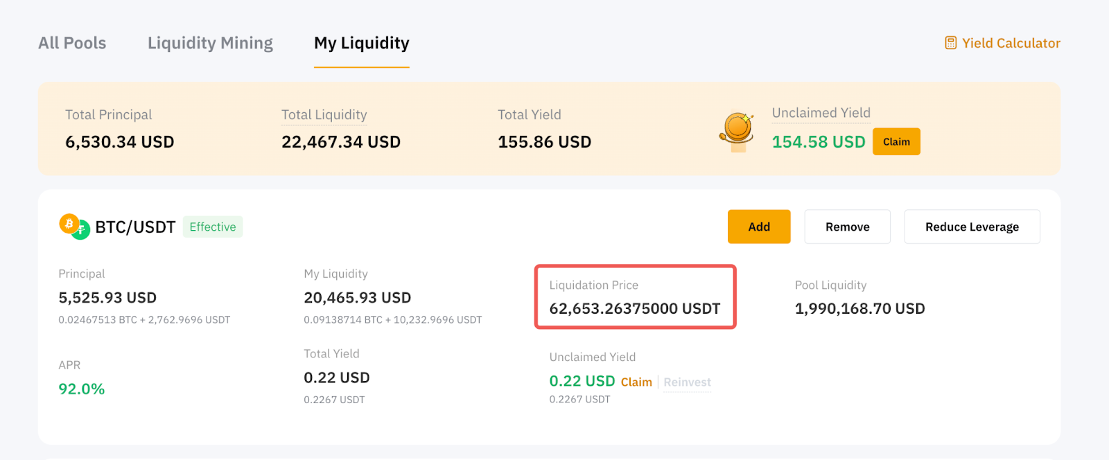 Harap diperhatikan bahwa semua prinsipal investasi dapat hangus jika posisi dilikuidasi. Anda dapat menambahkan lebih banyak USDT untuk mengurangi leverage dan meminimalkan risiko likuidasi.