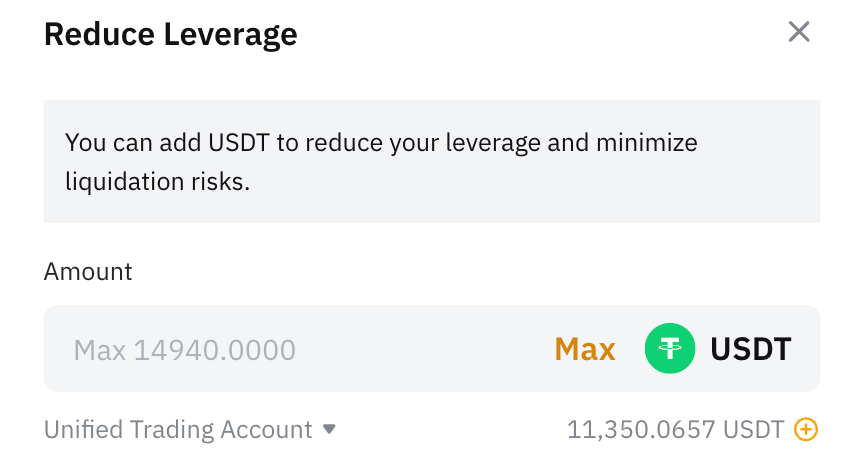 Harap diperhatikan bahwa jumlah maksimum USDT yang dapat Anda tambahkan adalah bagian dari pinjaman leverage. Ketika Anda menambahkan jumlah maksimum, leverage posisi Anda akan dikurangi menjadi 1x.