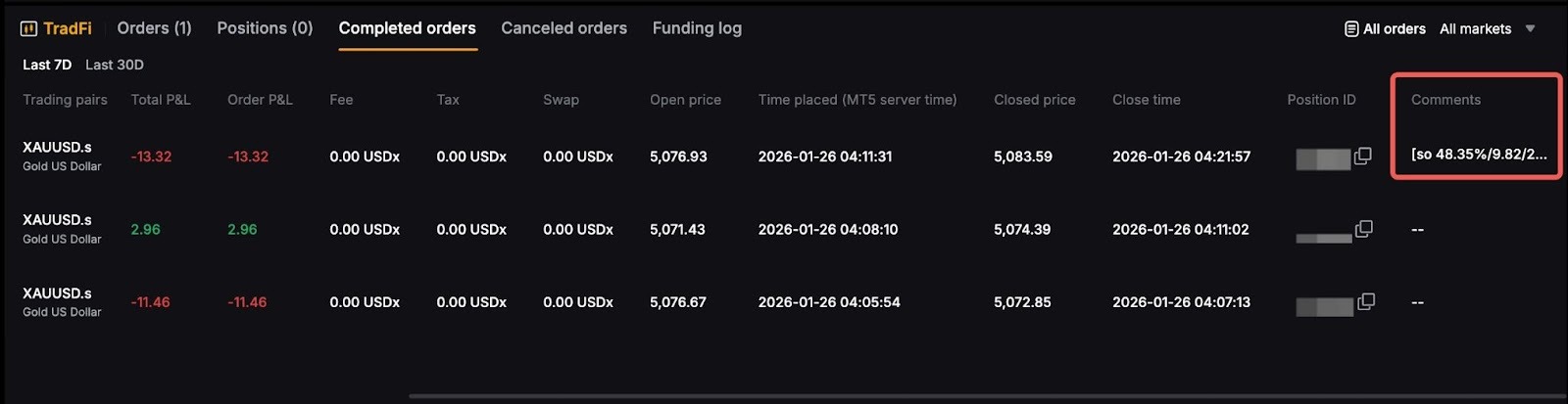 Ketika Penutupan Margin dipicu pada MT5, penutupan tersebut akan ditampilkan dengan cara berikut di tab Pesanan Terselesaikan.