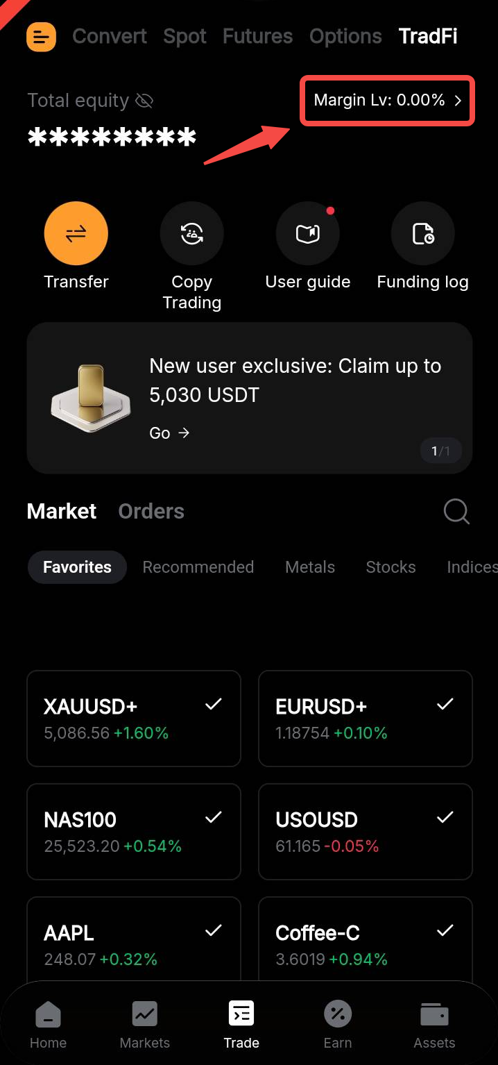 Tingkat Margin untuk TradFi dalam aplikasi seluler Bybit dapat ditemukan pada tab Trades di bawah ini.