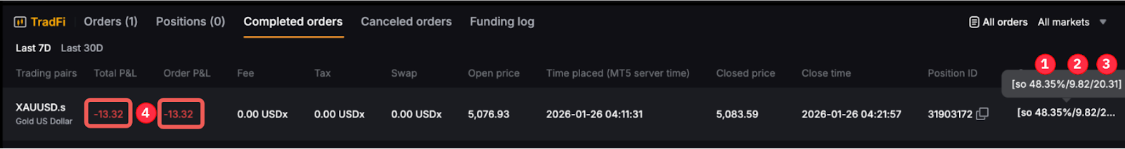 Untuk TradFi, level Stop-Out adalah 50%. Oleh karena itu, setelah Tingkat Margin akun TradFi pengguna turun ke atau di bawah 50%, proses penutupan margin akan terpicu.
