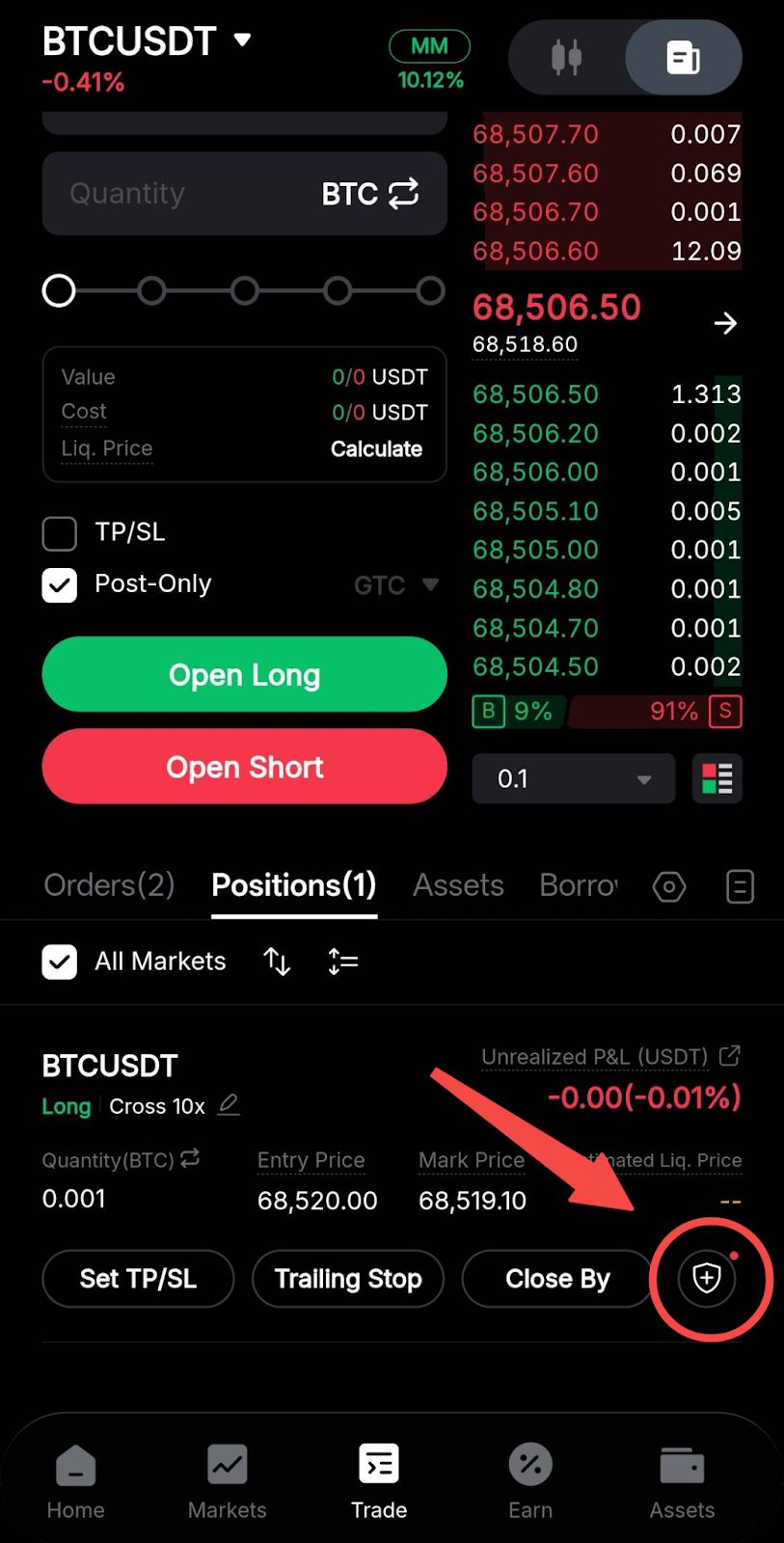 Langkah 1: Buka tab Posisi dan ketuk ikon perisai di bawah Kontrak Perpetual yang aktif untuk mengakses Perp Protect.
