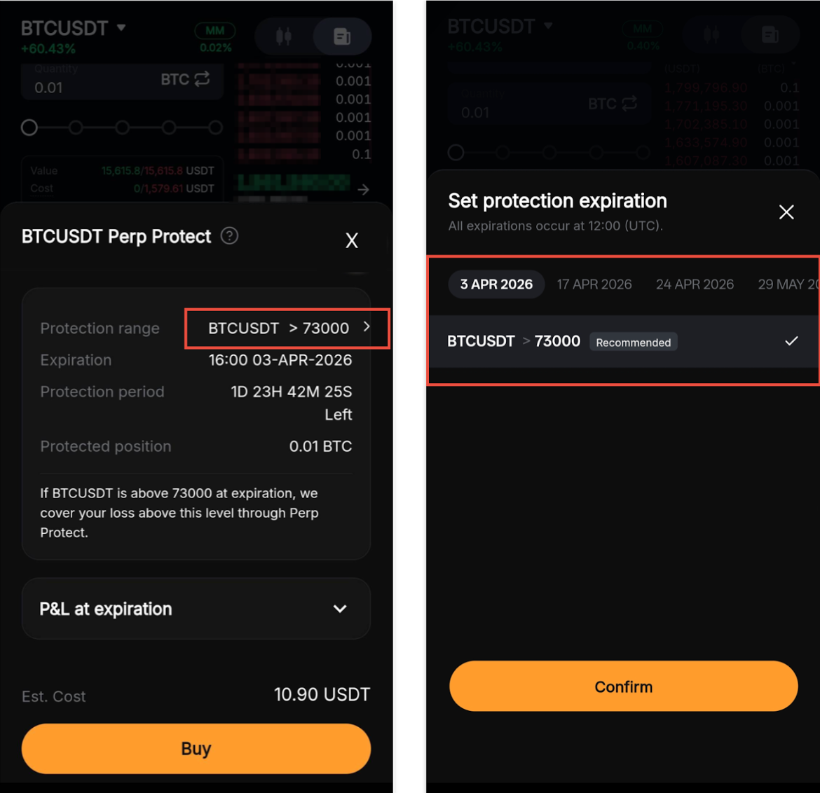 Langkah 2: Sistem akan memberikan rekomendasi cerdas untuk produk Perp Protect berdasarkan Posisi Saat Ini Anda, termasuk Leverage, Margin Awal, dan Harga pasar aset Saat Ini.