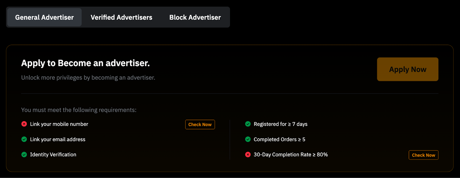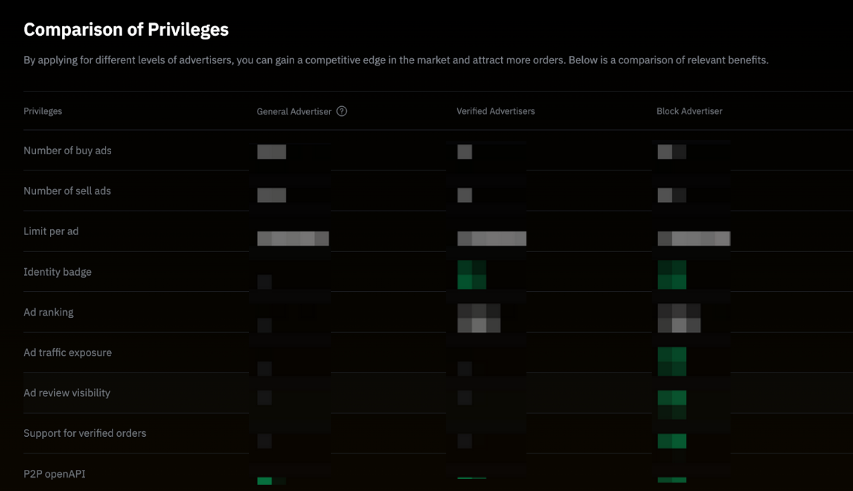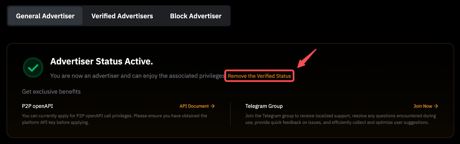 - Logo Tambahan: Menampilkan logo tambahan di halaman avatar dan profil Anda untuk memberi tahu pengguna P2P tentang status pengiklan blok Anda.