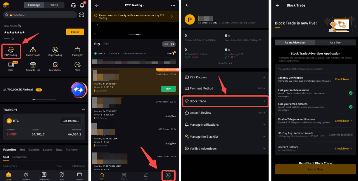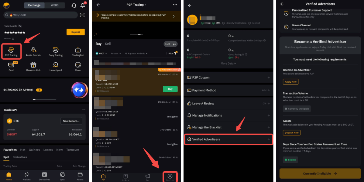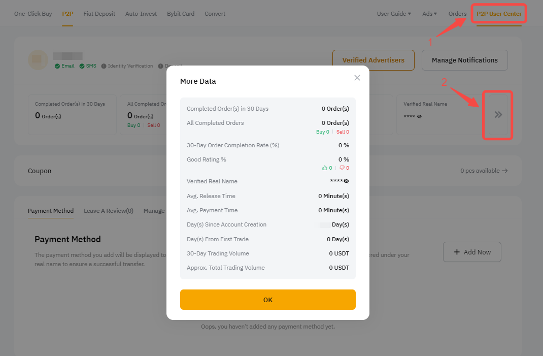 Untuk memeriksa apakah Anda memenuhi syarat untuk mengikuti salah satu level pengiklan umum, silakan melihat data akun perdagangan P2P Anda dengan mengeklik Pusat Pengguna P2P dan kemudian mengeklik ikon 2 panah kanan di situs web.