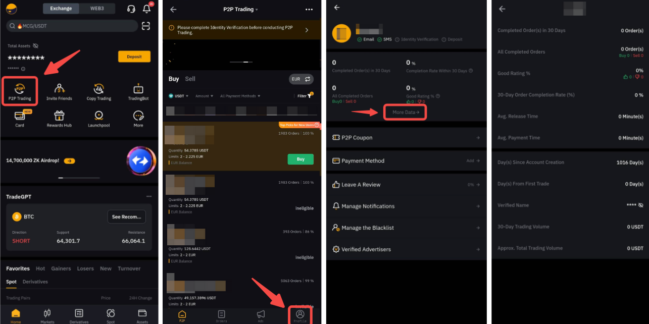 Jika Anda berada di aplikasi, silakan membuka halaman P2P dan ketuk ikon Profil untuk membuka Pusat Pengguna P2P. Di sana, ketuk Data lainnya untuk menampilkan informasi perdagangan P2P Anda.