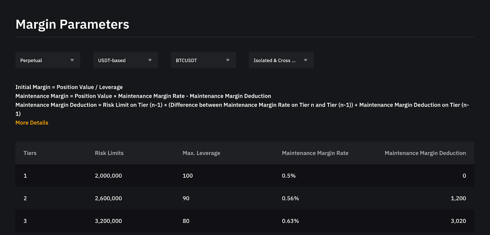 Saat nilai posisi meningkat, sistem akan secara otomatis menyesuaikan batas risiko pengguna berdasarkan nilai posisi dan nilai pesanan aktif. Akibatnya, persyaratan margin pemeliharaan dan margin awal juga akan berubah. Jika pengguna tidak memiliki pesanan atau posisi aktif, batas risiko akan secara default ditetapkan ke tingkat terendah.