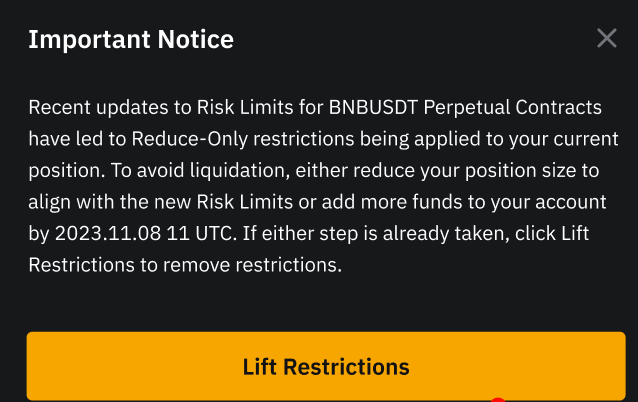 Ketika masa tenggang 10 hari terlewati, sistem akan secara otomatis menerapkan parameter risiko baru pada pasangan perdagangan, memungkinkan Anda untuk membuka posisi lagi. Namun, harap diingat bahwa posisi Anda mungkin mengalami risiko likuidasi setelah penyesuaian. Oleh karena itu, Anda disarankan untuk mengelola posisi Anda dengan mentransfer dana tambahan untuk mengikuti parameter risiko baru dalam masa tenggang 10 hari untuk menghindari potensi risiko likuidasi.