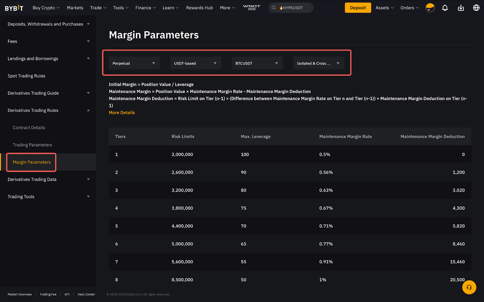 Bybit melakukan penilaian rutin terhadap likuiditas pasar. Apabila terjadi perubahan signifikan pada kondisi pasar, Batas Risiko dapat mengalami penyesuaian, dan parameter risiko yang disebutkan di bawah ini akan terpengaruh: