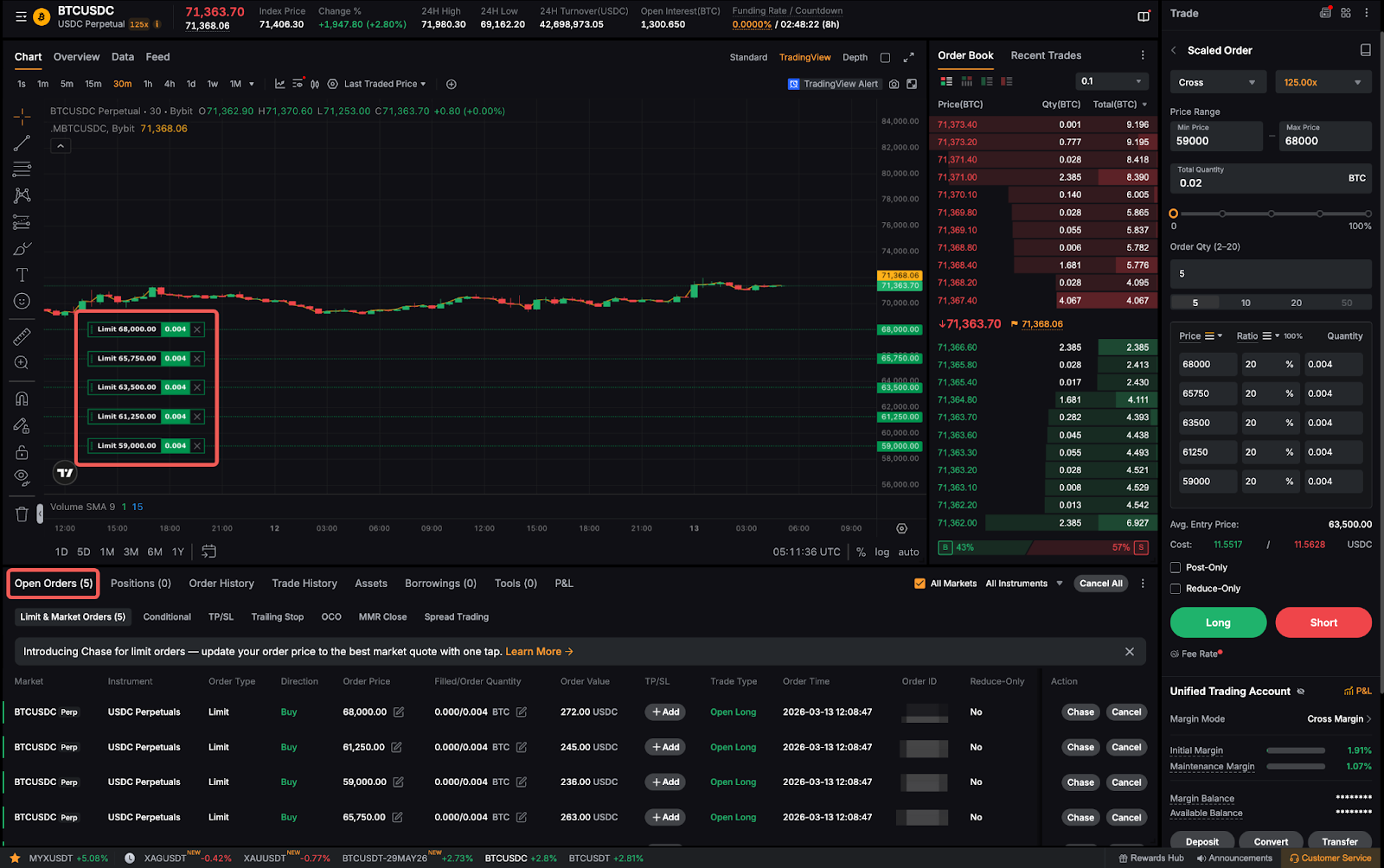 Harap dicatat bahwa total kuantitas minimum dan maksimum untuk Pesanan Berskala adalah 10 kali ukuran pesanan minimum dan maksimum. Contoh, ukuran pesanan minimum dan maksimum untuk BTCUSDT adalah 0,001 BTC dan 100 BTC. Alhasil, total kuantitas pesanan minimum dan maksimum untuk Pesanan Berskala masing-masing adalah 0,01 BTC dan 1000 BTC.