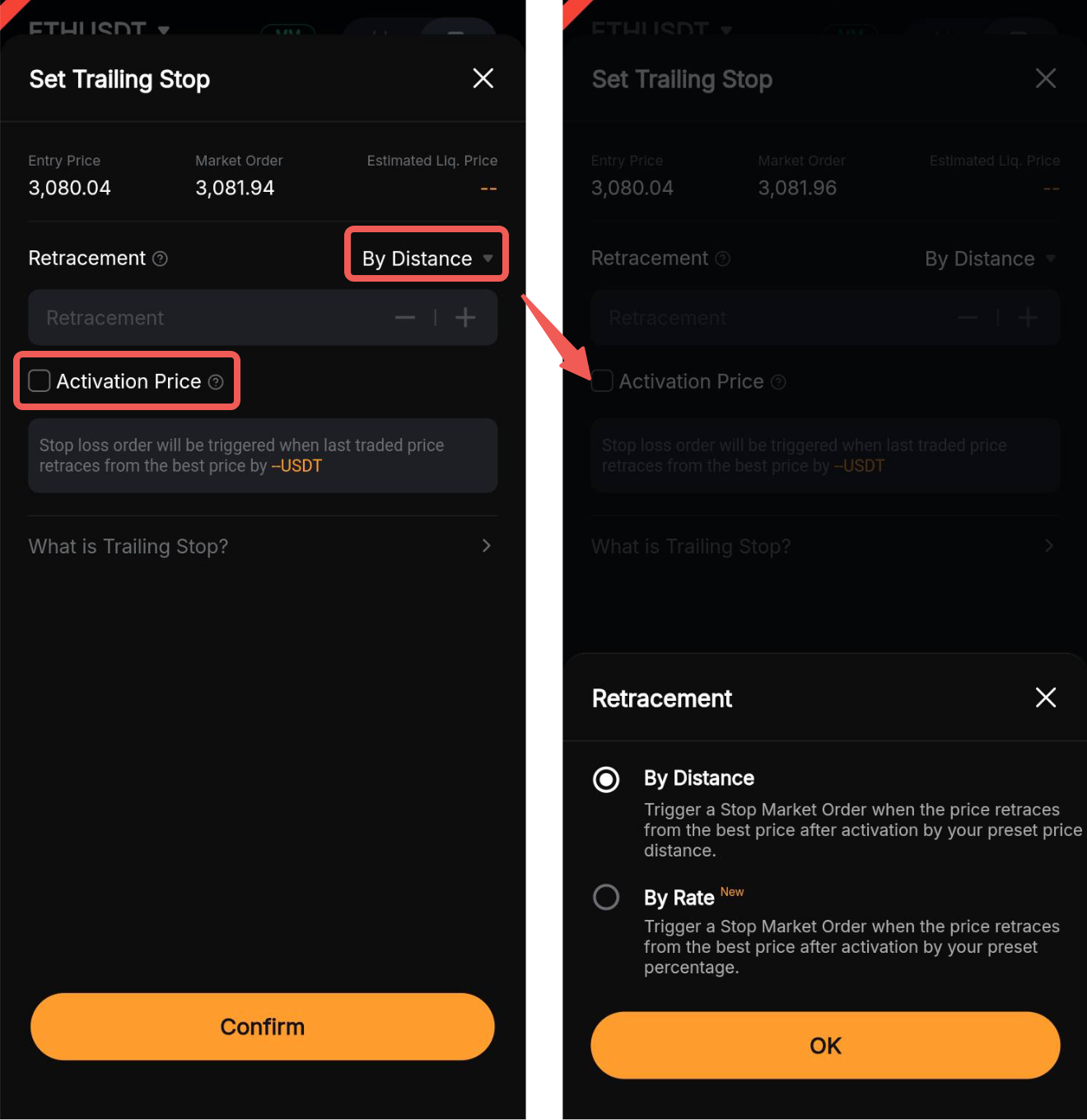Langkah 2: Pilih metode pemicu Retracement Anda (berdasarkan Tarif atau Jarak) dan tetapkan Harga Aktivasi jika diperlukan. Lalu, ketuk Konfirmasi.