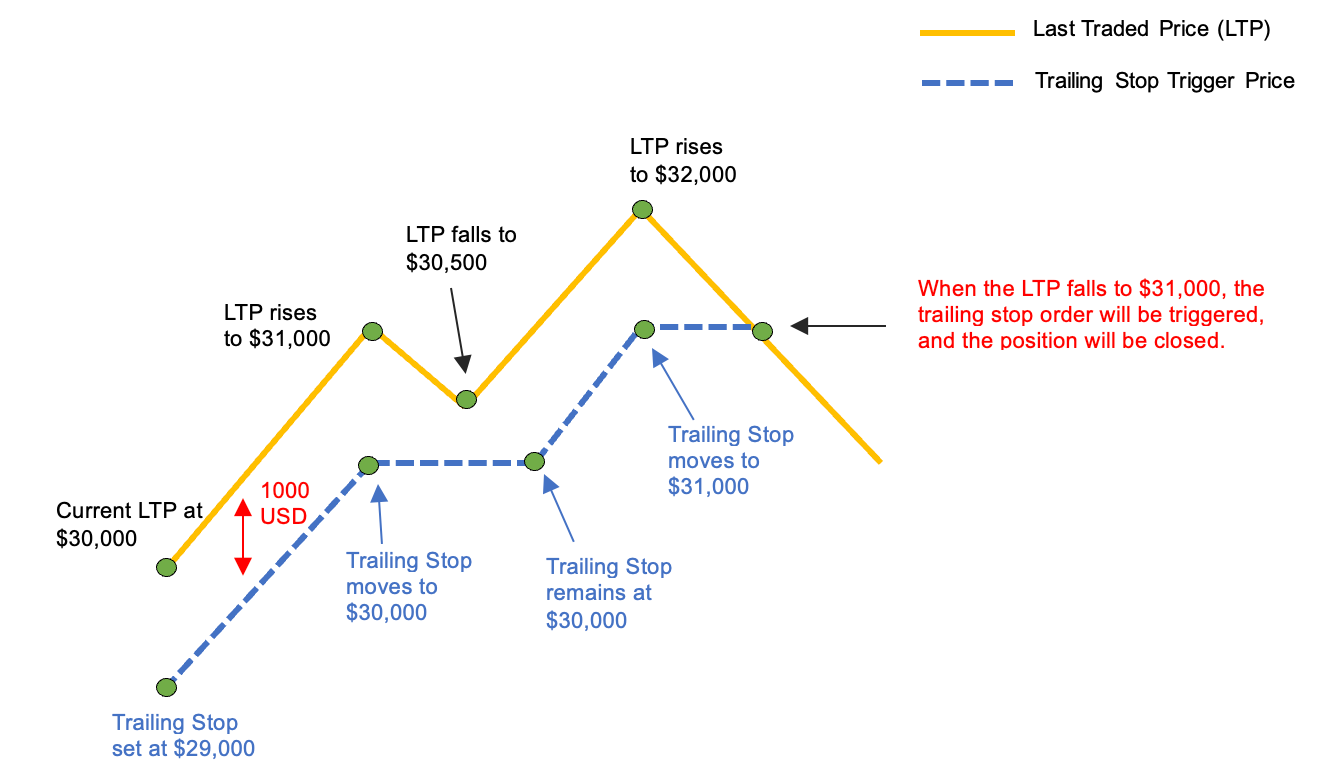 Misalkan pedagang A membuka posisi Long kontrak BTCUSD pada $30.000 dan menetapkan pesanan Trailing Stop dengan jarak retracement sebesar $1.000.